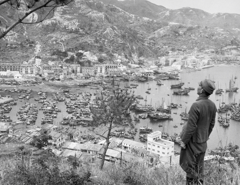 Sau Ki Wan where the Tanaka Butai landed the night of 18-19 December 1941 – Figure in foreground is Tanaka himself, taken 19 March 1947 from Lye Mun Barracks, Sai Wan Hill.