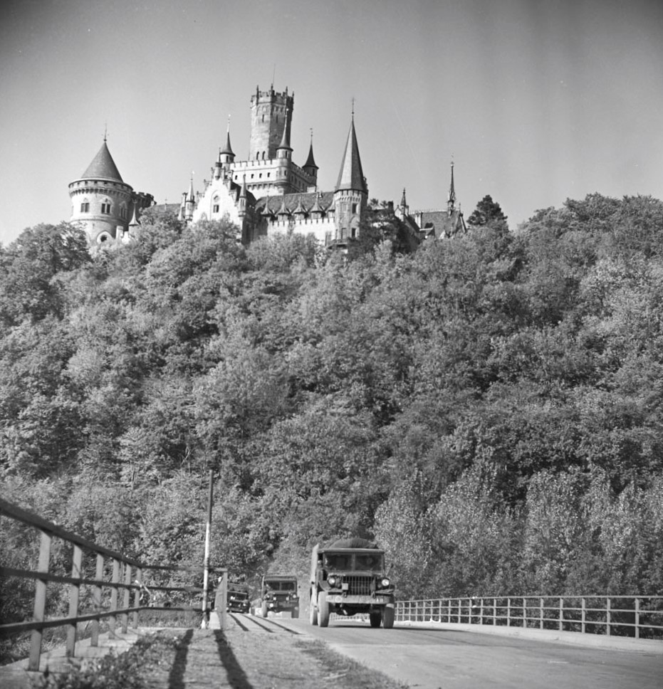 Trucks of the 1st Battalion, The Queen’s Own Rifles of Canada roll across the Leine River bridge as they race to take up positions during Exercise “Keen Blade”, a five-day tactical exercise involving the Canadian NATO brigade and units of the German Army’s 3rd Panzer Brigade. In the background are the battlements of historic Marienburg Castle, 15 Oct 1963.