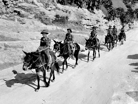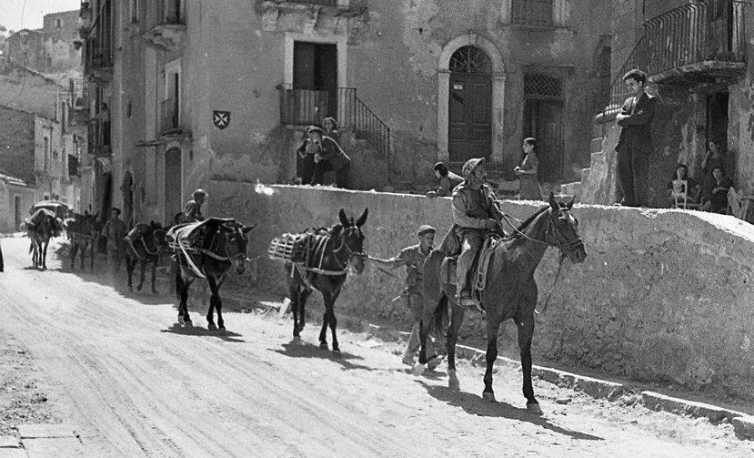 Canadian mule train through the damaged Italian town of Regalbuto, Sicily, in 1943.