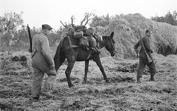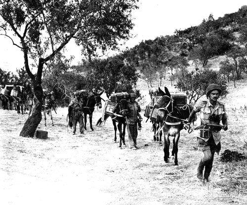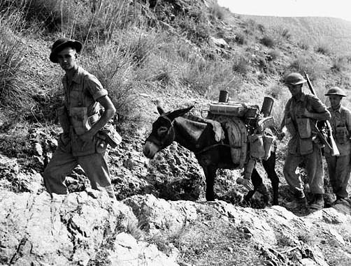 Saskatoon Light Infantry soldiers with their Universal Carrier and a mule carrying supplies, Italy, 9-18 October 1943.