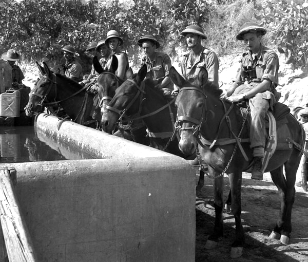 Pioneer platoon of the Royal Canadian Regiment watering their mules near Regalbuto, Italy, 4 August 1943.