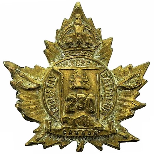 The 230th (Voltigeurs Canadiens Français) Battalion was authorized to be raised as an infantry battalion under General Order 69 of July 15th 1916 by the 70th Hull Regiment. The 230th Battalion was raised in the area surrounding Ottawa in both Eastern Ontario and Western Quebec from mainly French speaking forestry workers with mobilization headquarters at Hull. On November 6th 1916 the battalion was converted from an infantry to a forestry battalion after an urgent request from the Imperial Government in England for more skilled lumbermen. The 230th Forestry Battalion embarked for England on 23 January 1917 under command of Lieutenant-Colonel R.de Salaberry (G.G.F.G.), with a strength of 18 officers and 687 other ranks where it was absorbed into the Canadian Forestry Corps. The 230th Battalion was disbanded on 27 July 1918 under General Order 102 of 15 August 1918.
