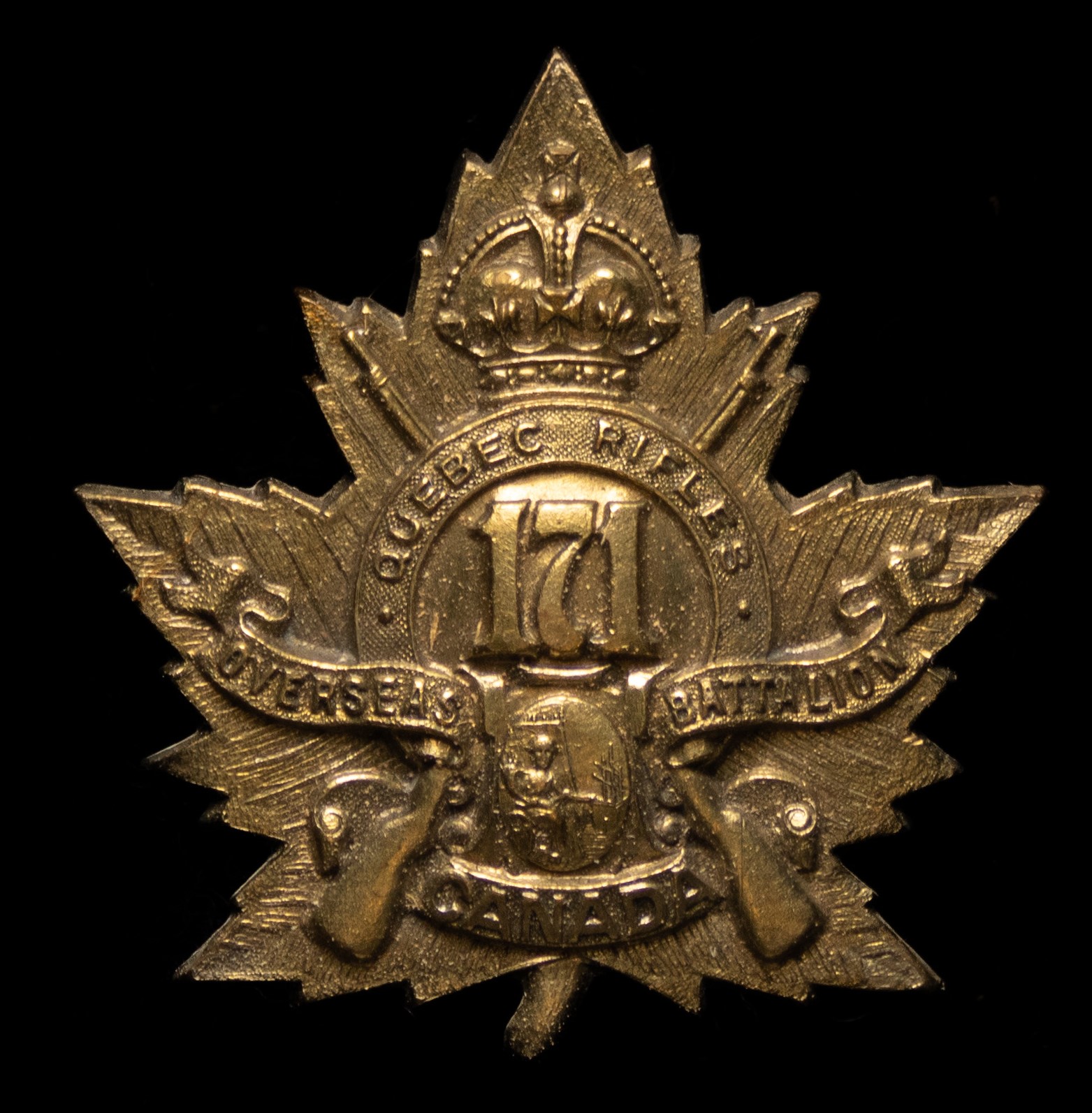 The 171st (Quebec Rifles) Battalion was recruited and mobilized at Quebec City under General Order 69 of July 15th 1916 by the 8th Royal Rifles of Canada this regiment previously having provided 368 volunteers to the 12th Battalion on its formation at Camp Valcartier in August 1914. The 171st Battalion sailed for England on 4 November  1916 under command of Lieutenant-Colonel Sir W. Price (Permanent Force) with a strength of 27 officers and 574 other ranks. After arrival a draft was sent to the 4th Pioneers the remainder of the battalion merging with the 148th Canadian Infantry Battalion from Montreal to form the 20th Reserve Battalion; this the reserve battalion for the three Canadian Black Watch battalions the 13th, 42ndand 73rd all then serving with the Canadian Corps on the Western Front. Being fully depleted of all ranks the 171st Canadian Infantry Battalion was disbanded effective July 27th 1917 under GO.89 of 1 September 1917.