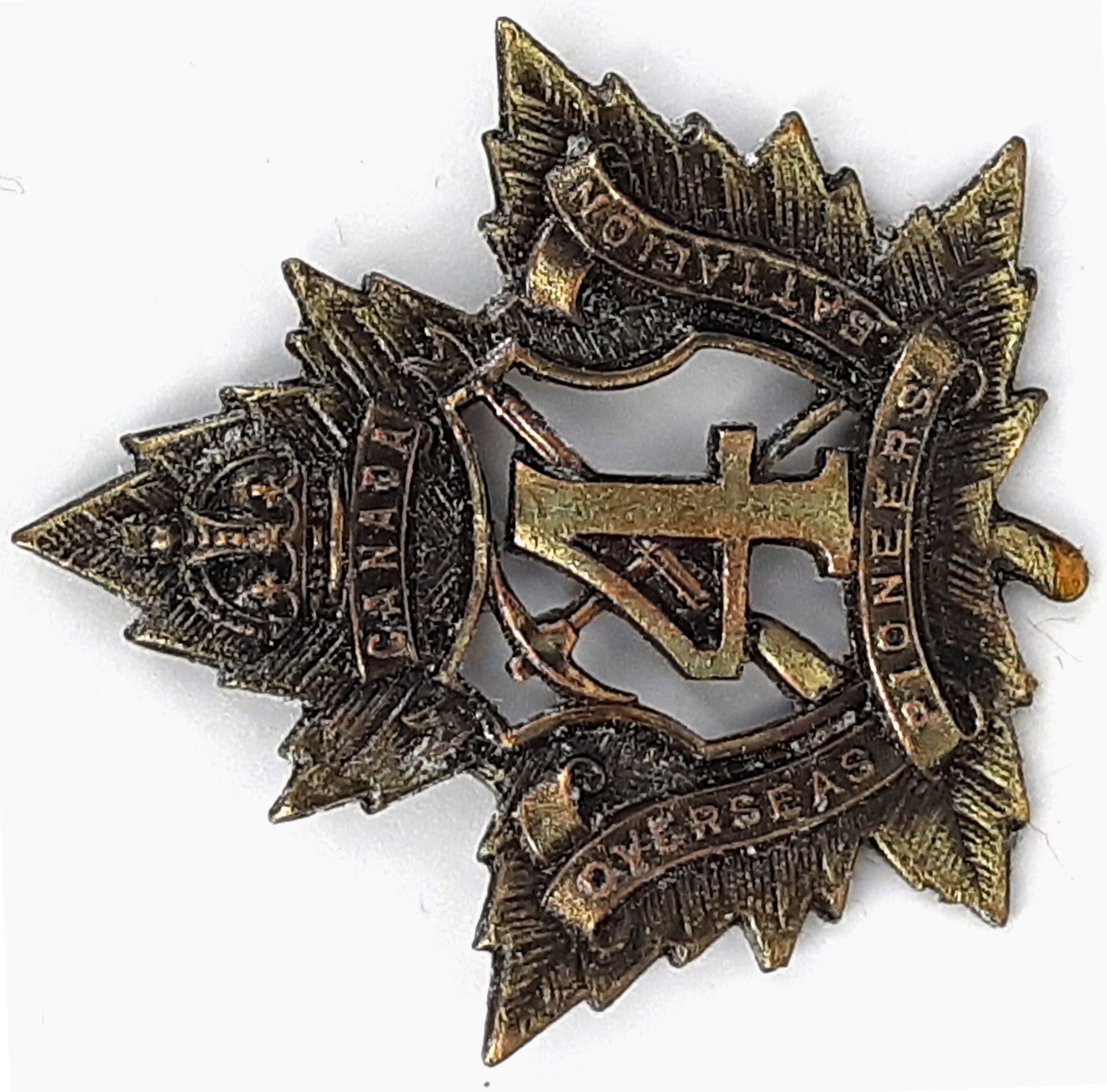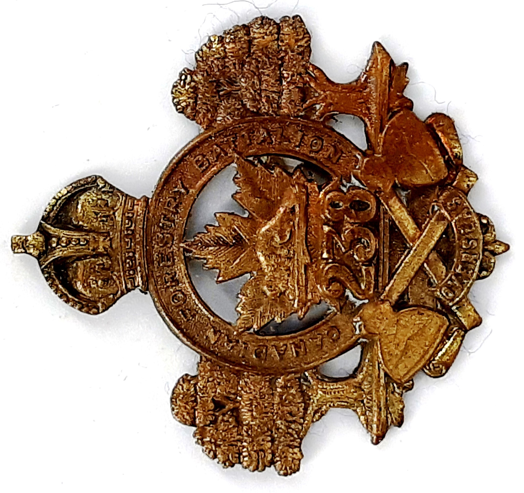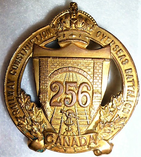 The 256th Overseas Infantry Battalion was raised in Northern Ontario as a specialized railway construction battalion with mobilization headquarters at the Exhibition Grounds, Toronto under General Order 48 of 1 May 1917. The actual date of formation is currently undetermined but the badge design was forwarded to Ottawa January 27th 1917, and approved on 6 February 1917. The 256th Battalion was raised by the 97th Algonquin Rifles the regiment previously having provided 263 volunteers to the 15th Battalion on its formation at Camp Valcartier in August 1914 and later raising the 159th and 228th Battalions. The 256th Battalion embarked for England on 28 March 1917 under command of Lieutenant-Colonel W.A. McConnell (109th Regiment), with a strength of 18 officers and 531 OR’s where it was assigned to the Canadian Railway Troops Depot at Purfleet. The 256th Battalion was designated as the 10th Battalion Canadian Railway Troops under General Order 63 of June 15th 1917 sailing for France on 9 June 1917 where it served on the Western Front until the Armistice in November 1918. The 10th Battalion Canadian Railway Troops was disbanded along with the rest of the Canadian Railway Troops under General Order 196 of 1 November 1920.