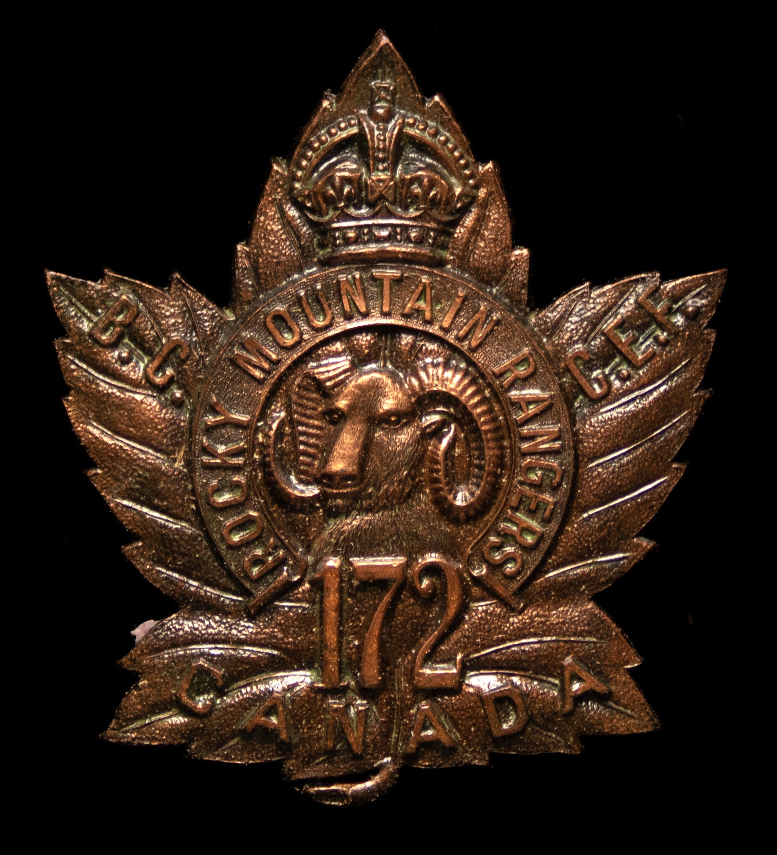 The 172nd (Rocky Mountain Rangers) Battalion was recruited in the southern interior of British Columbia with mobilization headquarters at Kamloops under General Order 69 of 15 July 1916 by the 102nd Rocky Mountain Rangers this regiment previously having provided 123 volunteers to the 7th Battalion on its formation at Camp Valcartier in August 1914. The 172nd Battalion sailed for England October 25th 1916with 32 officers and 972 other ranks under command of Lieutenant-Colonel J. R. Vicars (102nd Rocky Mountain Rangers), where in January 1917 it amalgamated with other BC battalions then in England to form the 24th Reserve Battalion. The 172nd Canadian Infantry Battalion was disbanded effective July 17th1917 under General Order 82 of 1 June 1918.