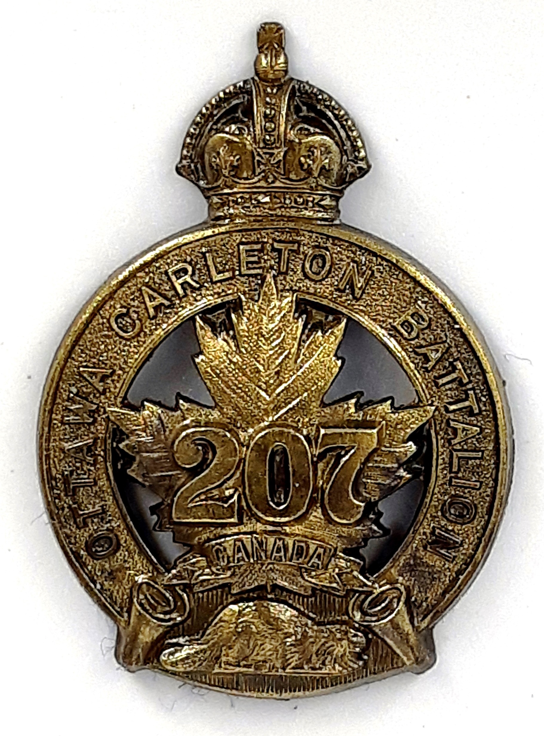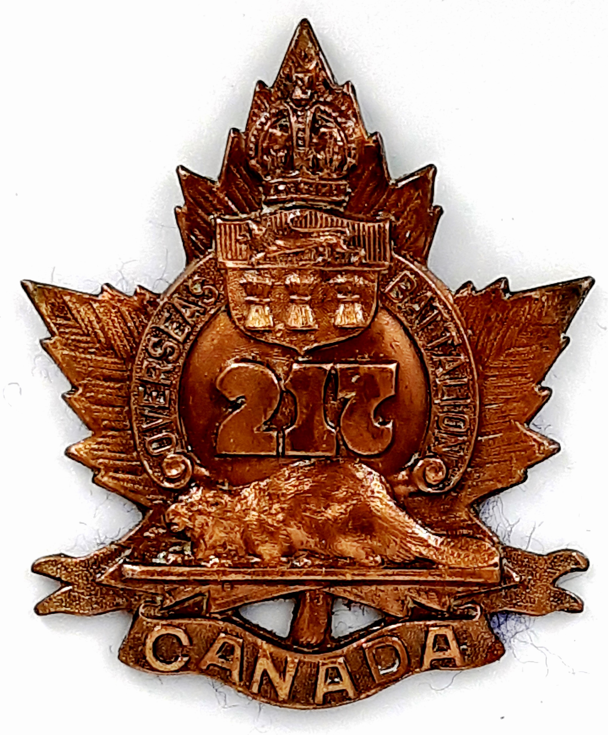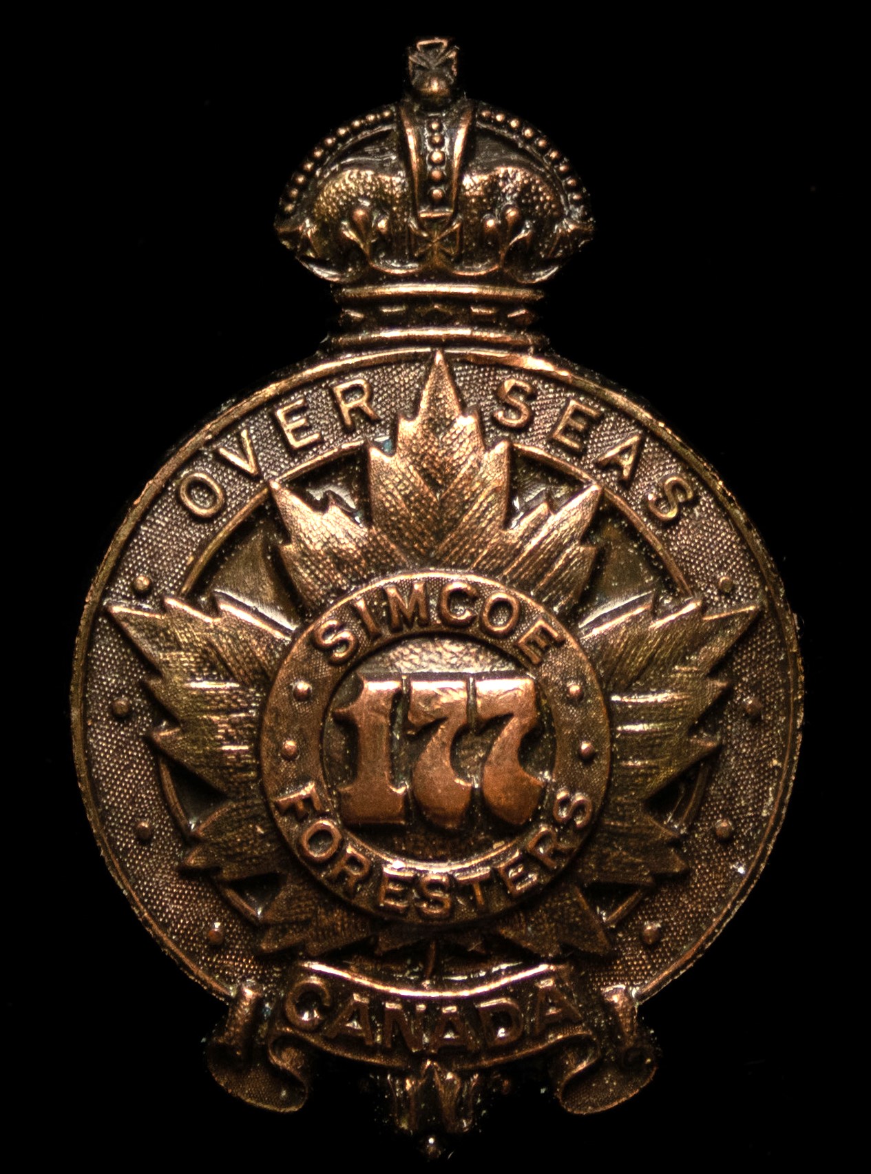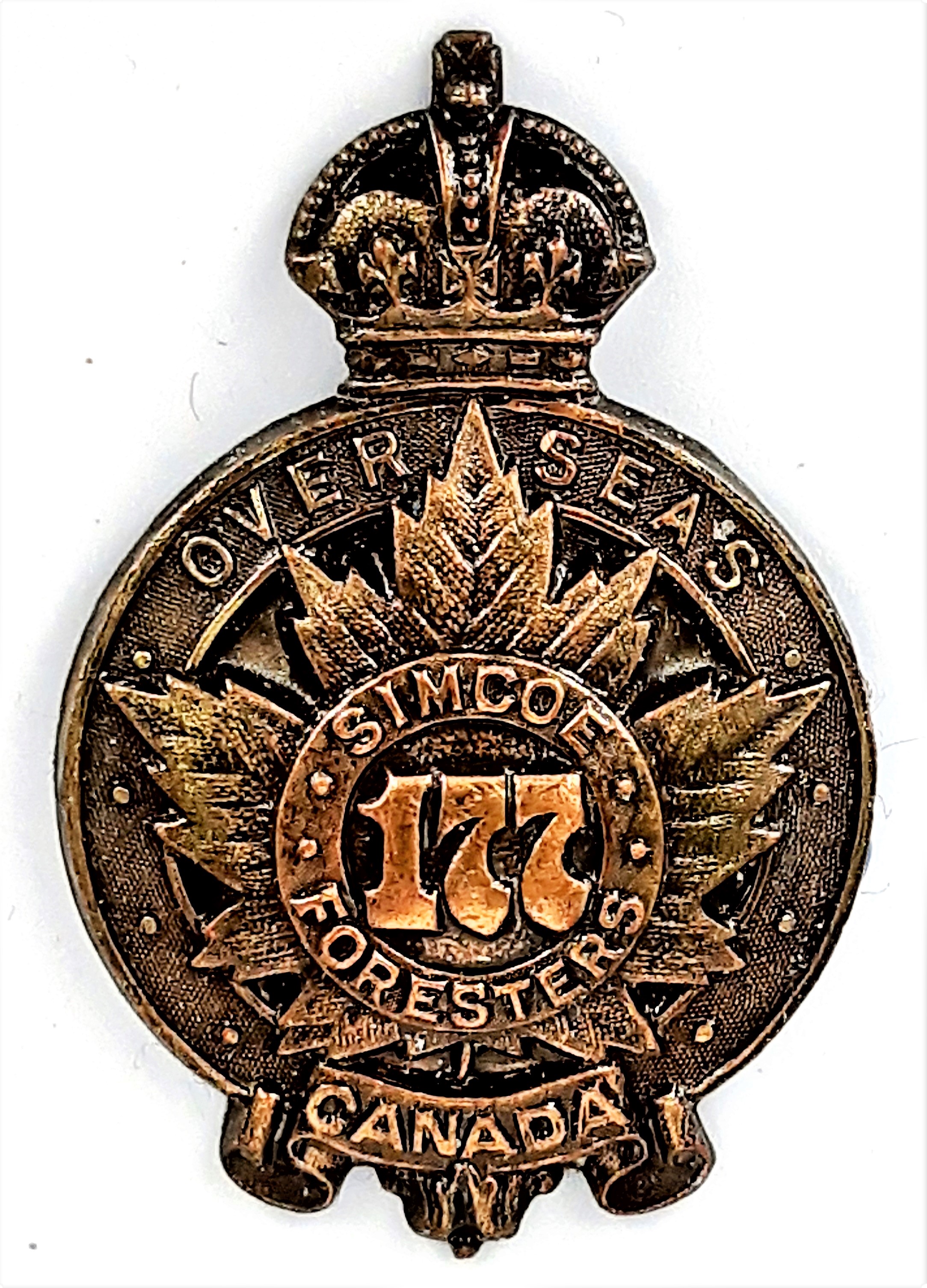 The 177th (Simcoe Foresters) Battalion was recruited in Simcoe County with mobilization headquarters at Barrie under General Order 69 of July 15th 1916 by the 35th Simcoe Foresters this regiment previously having provided 124 volunteers to the 4th Battalion on its formation at Camp Valcartier in August 1914.The regiment also raised the 157th Battalion the badges for both battalions, including interim patterns, being almost identical. The 177th Battalion sailed for England on 3 May 1917 under command of Lieutenant-Colonel J.B. McGhee (35th Simcoe Foresters), with a strength of 19 officers and 549 other ranks. After its arrival the battalion was absorbed into the 3rd Reserve Battalion one of two reserve battalions for the 1st Central Ontario Regiment supplying reinforcements for the 4th and 19th Battalions and the 2nd and 4th Canadian Mounted Rifles serving with the Canadian Corps on the Western Front. Being fully depleted of all ranks the 177th Canadian Infantry battalion was disbanded effective 15 April 1918 under General Order 60 of 1 June 1918.
