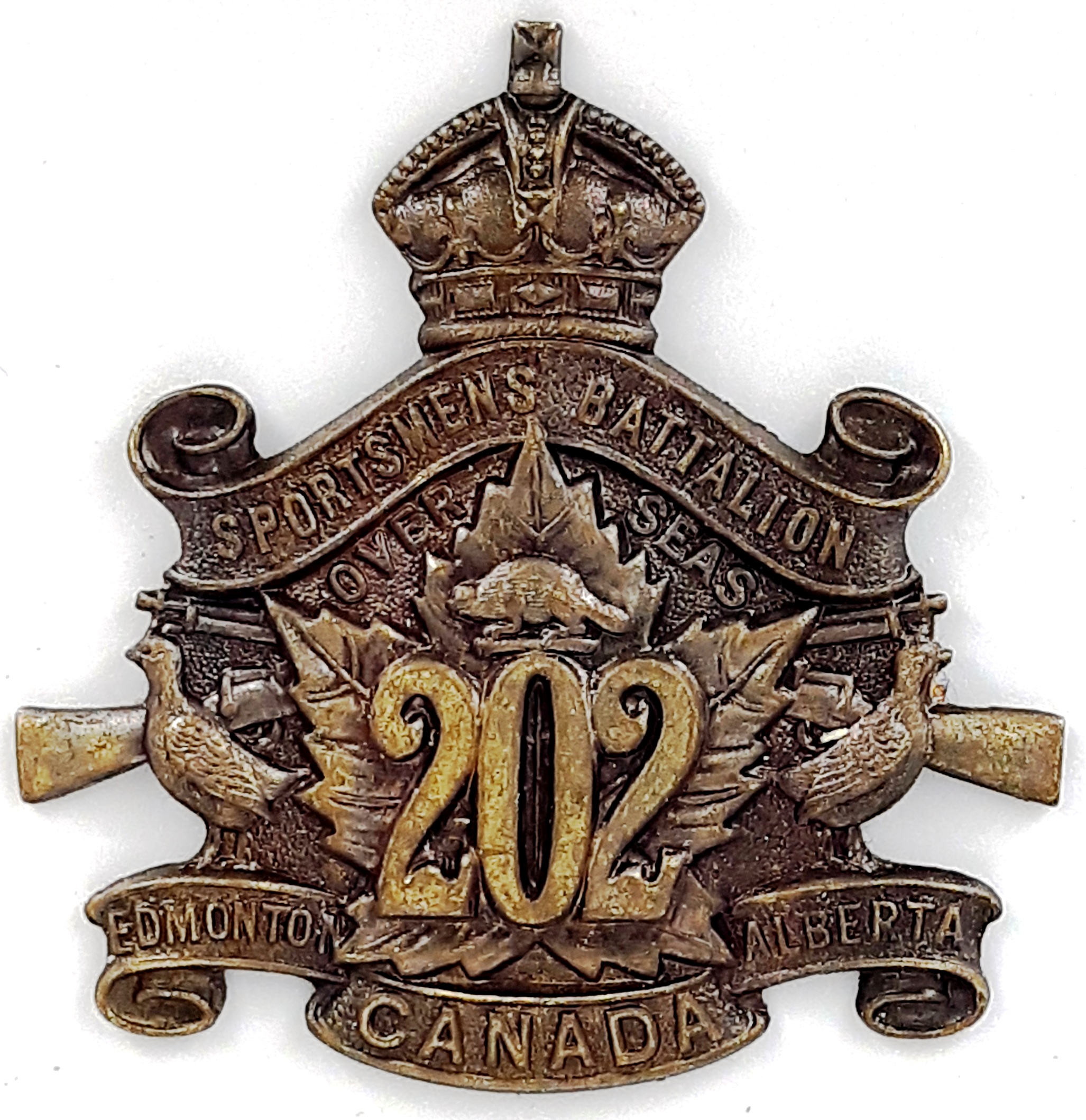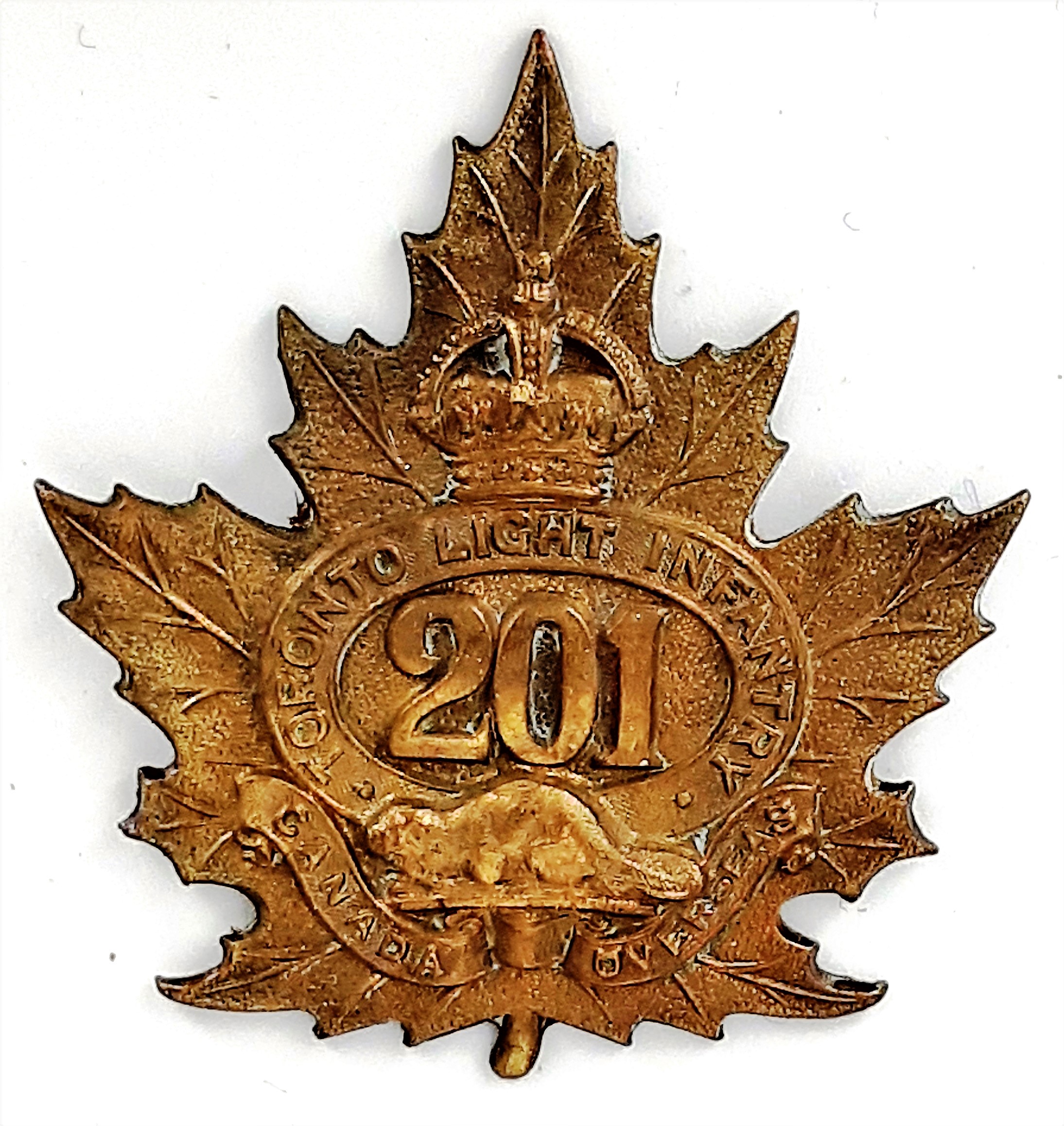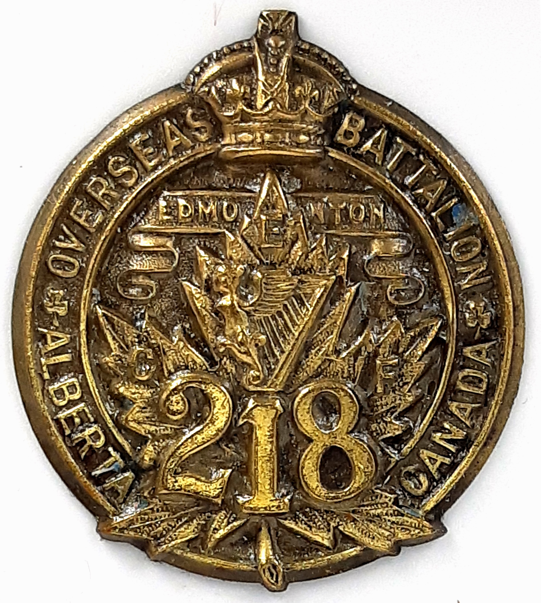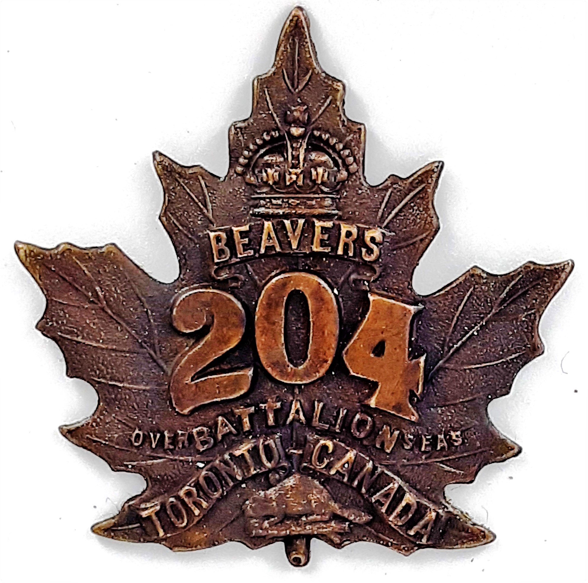 The 177th (Simcoe Foresters) Battalion was recruited in Simcoe County with mobilization headquarters at Barrie under General Order 69 of July 15th 1916 by the 35th Simcoe Foresters this regiment previously having provided 124 volunteers to the 4th Battalion on its formation at Camp Valcartier in August 1914.The regiment also raised the 157th Battalion the badges for both battalions, including interim patterns, being almost identical. The 177th Battalion sailed for England on 3 May 1917 under command of Lieutenant-Colonel J.B. McGhee (35th Simcoe Foresters), with a strength of 19 officers and 549 other ranks. After its arrival the battalion was absorbed into the 3rd Reserve Battalion one of two reserve battalions for the 1st Central Ontario Regiment supplying reinforcements for the 4th and 19th Battalions and the 2nd and 4th Canadian Mounted Rifles serving with the Canadian Corps on the Western Front. Being fully depleted of all ranks the 177th Canadian Infantry battalion was disbanded effective 15 April 1918 under General Order 60 of 1 June 1918.