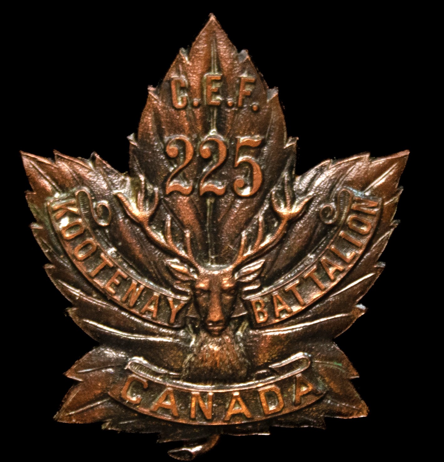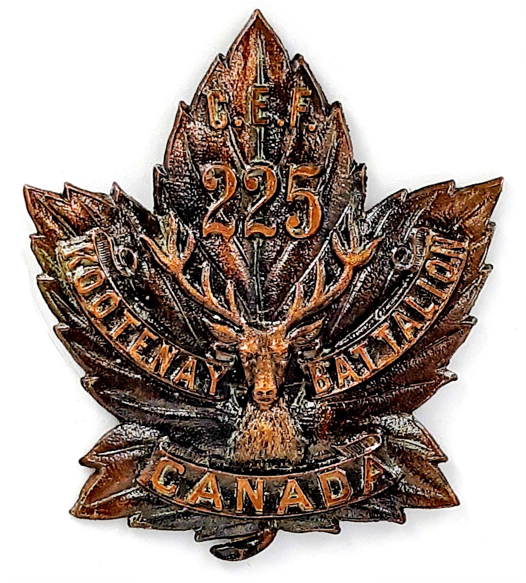 The 225th (Kootenay) Battalion was recruited by the 107th East Kootenay Regiment in the lower British Columbia interior at Fernie, Cranbrook, Nelson and Grand Forks with mobilization headquarters at Fernie under General Order 69 of 15 July 1916. The regiment previously providing a large detachment from both the East and West Kootenay’s these had providing 310 volunteers to the 7th Battalion on its formation at Camp Valcartier in August 1914. The regiment later raised the 54th Battalion. The 225th Battalion embarked for England January 25th 1917 under command of Lieutenant-Colonel J. Mackay (107th East Kootenay Regiment), with a strength of 20 officers and 427 other ranks where the battalion was absorbed into the 1st Reserve Battalion. Being fully deleted of all ranks the 225th Canadian Infantry Battalion was disbanded effective September 17th 1917 under General Order 82 of 1 June 1918.