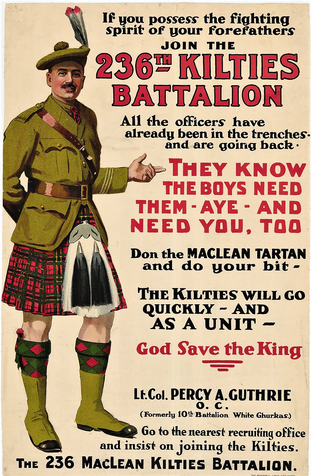 The 236th (New Brunswick Kilties) Battalion, nicknamed ‘Sir Sam‘s Own’ was authorized to be raised in New Brunswick with mobilization headquarters at Fredericton under General Order 69 of July 15th 1916The 236th Battalion was one of three battalions to be raised primarily by the 74th Regiment (The New Brunswick Rangers) this regiment previously having contributed 73 volunteers to the 12th Battalion on its formation at Camp Valcartier in August 1914 and later the 55th and 145th Battalions. By mid 1916 the available supply of volunteers for the CEF had slowed down to just a trickle particularly in smaller rural areas. Recruiting for the 236th Battalion was going slowly until the ever energetic Sir Sam Hughes made as wing through the Northern United States with the Pipes and Drums of the 5th Royal Highlanders of Canada (The Black Watch) after which the ranks of the 236th were quickly filled with expatriate Britons and Americans of Scottish ancestry. In honour of the American volunteers a new Balmoral badge was introduced with the motto ‘MacLean Kilties of America ‘ replacing the former ‘The New Brunswick Kilties’. The 236th Battalion sailed for England November 17th 1917 with a strength of 27 officers and 1029 other ranks under command of Lieutenant-Colonel P.A. Guthrie (71st York Regiment), this number included the 247th Battalion raised in the counties of Victoria and Haliburton, Ontario, Sir Sam Hughes’s own political riding in which recruiting had dried up completely. In February 1917 the 236th was tentatively assigned to the 5th Canadian Division but was withdrawn in May 1917 and absorbed into the 20th Reserve Battalion, this the reinforcing battalion for the 13th and 42nd (Black Watch) Battalions serving in the field with the Canadian Corps in France and Flanders. The pipes and drums of the 236thamalgamated with other pipe bands to form the pipe and drums of the 20th Reserve Battalion. The 236th Canadian Infantry Battalion was disbanded under General Order 149 of 15 September 1920.