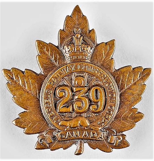 The 239th Overseas Railway Construction Battalion was recruited from skilled railway personnel from Ontario and Quebec with mobilization headquarters at Camp Valcartier on 5 May 1916 under General Order 69 of 15 July 1916. The battalion embarked for England on 15 December 1916 under command of Lieutenant -Colonel J.B.L. MacDonald (C.E.), with a strength of 26 officers and 738 OR’s. After its arrival the 239th Overseas Construction Corps was redesignated as the 3rd Battalion Canadian Railway Troops sailing for France on 22 March 1917 where the unit served for the duration of the war. The 239th Overseas Railway Construction Battalion was disbanded under General Order 149 of 15 September 1920. The 3rd Battalion Canadian Railway Troops under General Order 196 of 1 November 1920.