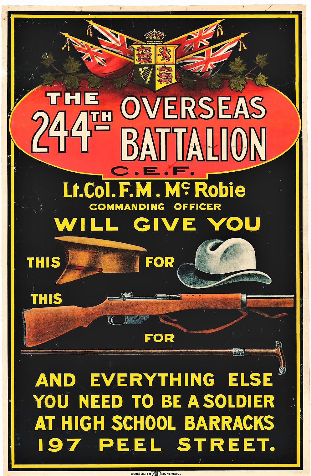 The 244th (Kitchener’s Own) Battalion was recruited in Quebec June 6th 1916 with mobilization headquarters at Montreal under General Order 69 of July 15th 1916. The battalion was raised by the 3rdVictoria Rifles of Canada the regiment previously having provided 351 volunteers to the 14th Battalion on its formation at Camp Valcartier in August 1914 later raising the 24th and 60th Battalions. The 244th Battalion embarked for England on 28 March 1917 under command of Lieutenant-Colonel F.M. McRobie (3rd Victoria Rifles of Canada), with a strength of 27 officers and 604 OR’s where the battalion was absorbed into the 23rd Reserve Battalion. Being fully depleted of all ranks the 244th Canadian Infantry Battalion was disbanded effective 27 July 1917 under General Order 89 of 1 September 1917.