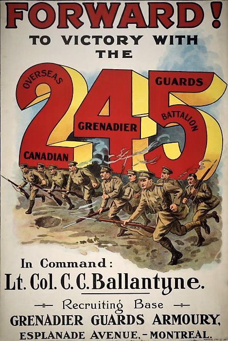 The 245th (Canadian Grenadier Guards) Battalion was raised and mobilized at Montreal June 6th 1916 under General Order 69 of 15 July 1916. The battalion was raised by the 1st Regiment, the Grenadier Guards of Canada this previously having provided 350 volunteers to the 14th Battalion on is formation at Camp Valcartier in August 1914 and later raising the 87th Battalion this serving in the 11th Infantry Brigade, 4th Canadian Division. The 245th Battalion embarked for England on 3 May 1917 under command of Lieutenant-Colonel C.C. Ballantyne with a strength of 16 officers and 274 OR’s where it was absorbed into the 23rd Reserve Battalion. Being fully depleted of all ranks the 245th was disbanded effective 17 July 1917 under General Order 82 of 1 June 1918.