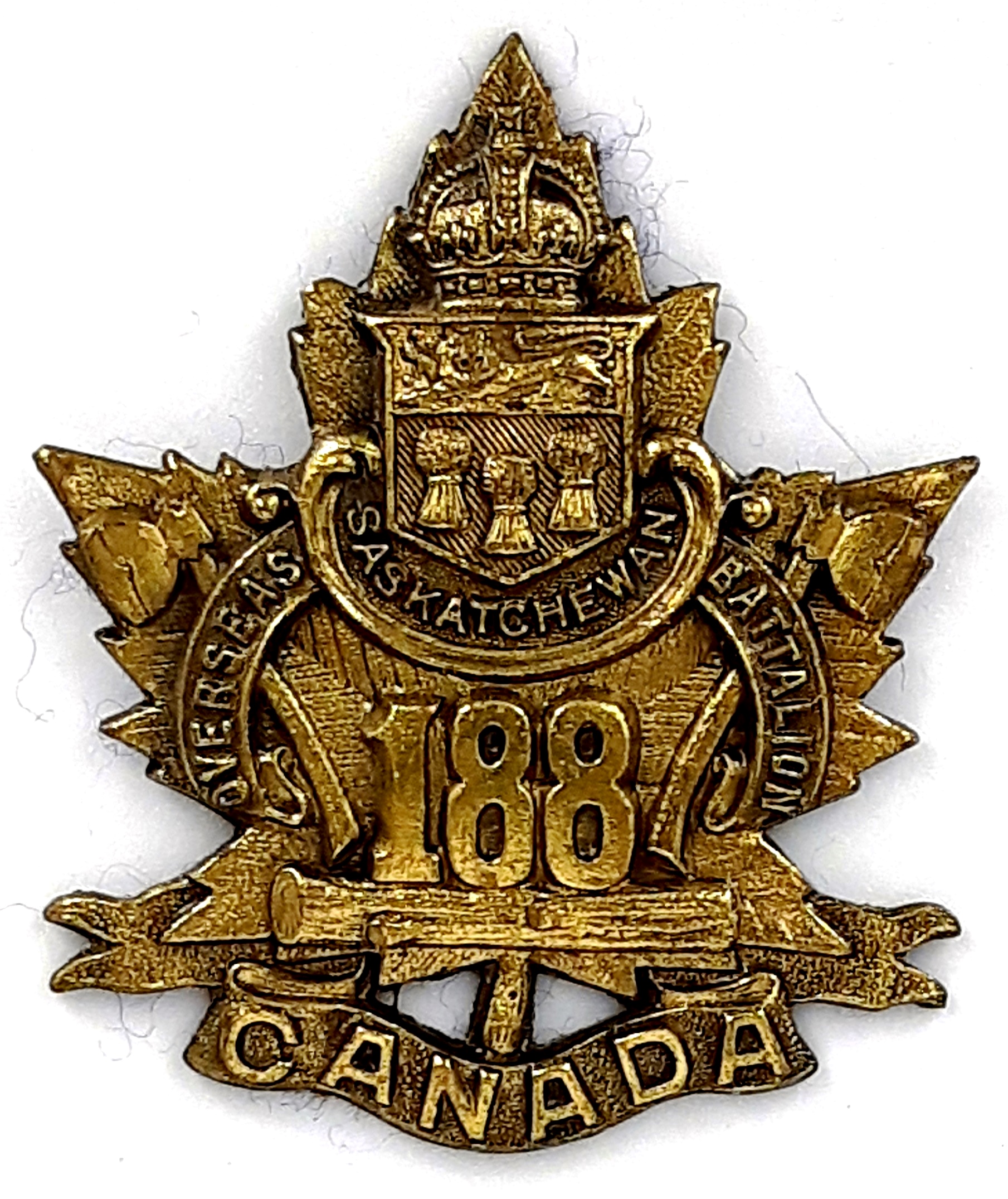 The 188th (Saskatchewan) Battalion was recruited in Northern Saskatchewan with mobilization headquarters at Prince Albert under General Order 69 of 15 July 1916 by the 52nd Regiment (Prince Albert Volunteers) this regiment previously having provided 150 volunteers to the 11th Battalion on its formation at Camp Valcartier in August 1914 and subsequently to the 53rd, 65th and 96th Infantry Battalions. The 188th Battalion embarked for England October 13th 1916 with 32 officers and 1004 other ranks under command of Lieutenant-Colonel S.J. Donaldson (Honorary rank), where in January 1917 amalgamated with other Saskatchewan battalions in England to form the 15th Reserve Battalion. The 188th Canadian Infantry Battalion was disbanded effective 27 July 1917 under General Order 89 of 1 September 1917.