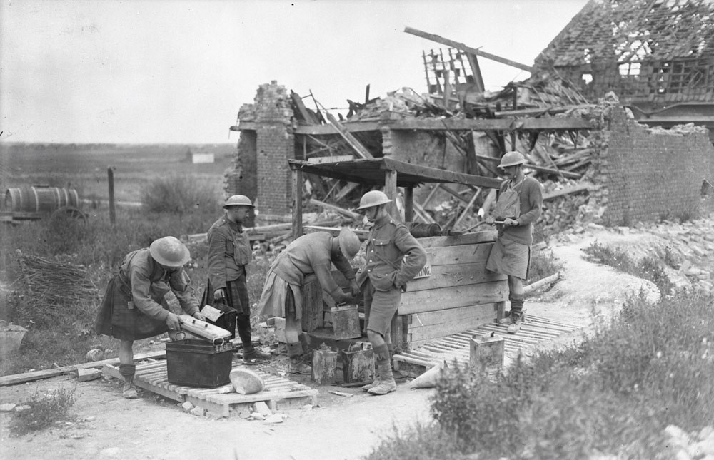 Canadian Kilties drawing water to take to the chums in the line in lens. September 1917.