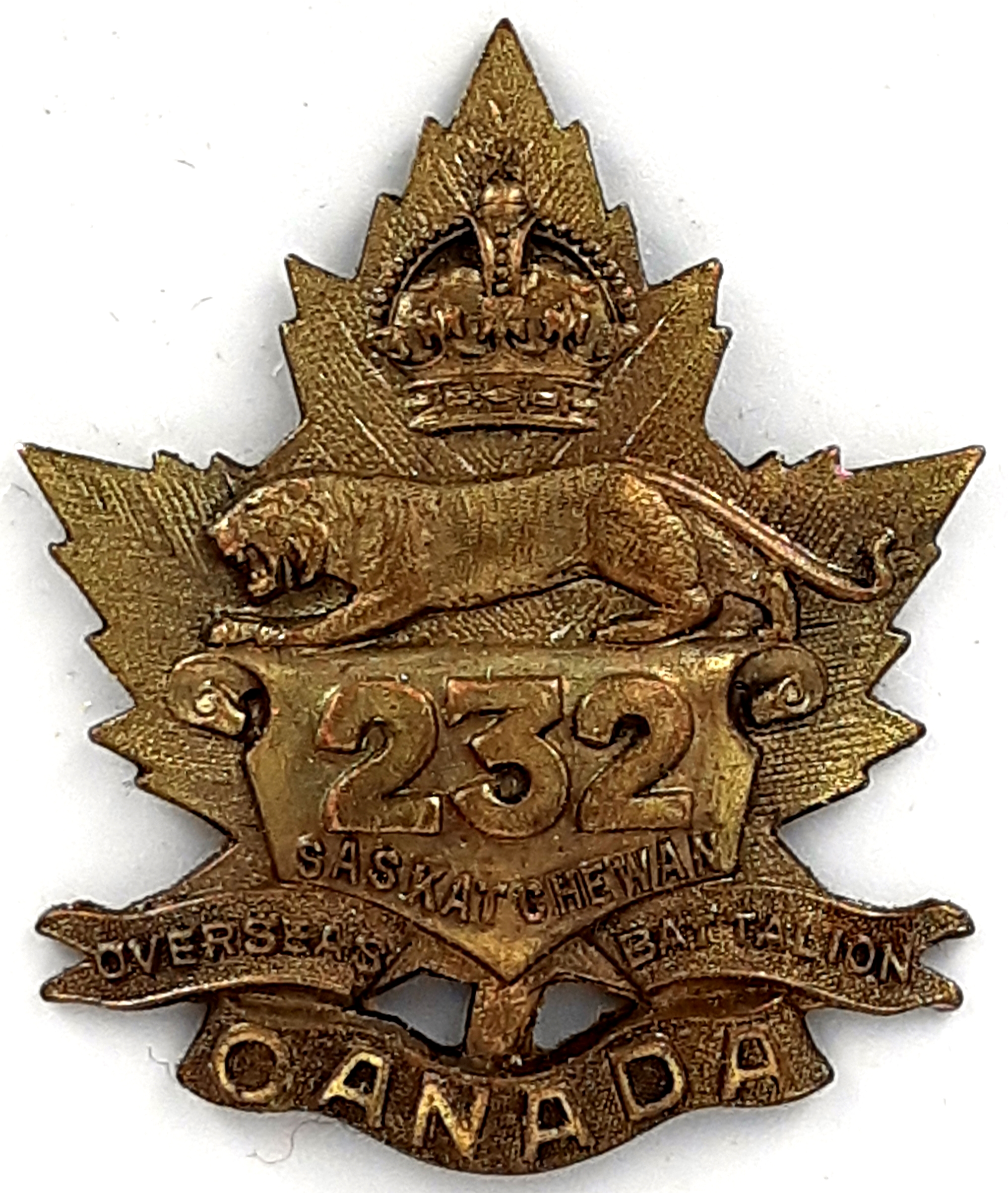 The 232nd (Saskatchewan) Battalion was recruited in the area surrounding Battleford in Saskatchewan with mobilization Headquarters at Battleford under General Order 69 of July 15th 1916. The 232nd Battalion was raised in part by 52nd Prince Albert Volunteers and the 105th Regiment (Saskatoon Fusiliers) these regiments previously having provided 150 and 255 volunteers respectively to the 11th Battalion on its formation at Camp Valcartier in August 1914. These regiments also later helped raise the 53rd 65th, 96th,and 188th Battalions. The 232nd Battalion embarked for England on 18 April 1917 under command of Lieutenant-Colonel R.P. Laurie with a strength of 13 officers and 286 other ranks where the battalion was absorbed by the 15th Reserve Battalion. Being fully depleted of all ranks the 232nd Canadian Infantry Battalion was disbanded effective October 12th 1917 under General Order 82 of 1 June 1918.