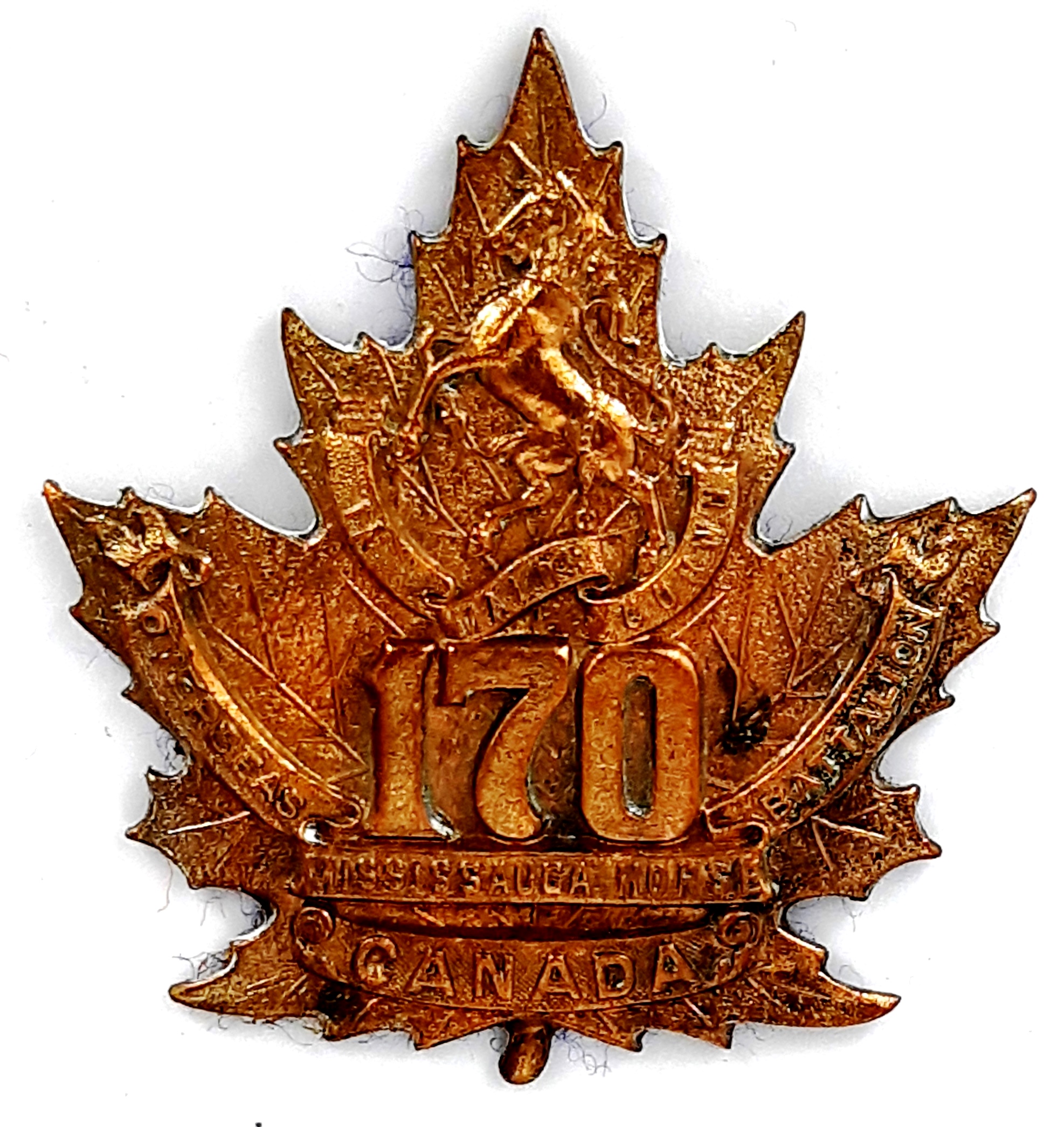 The 170th (Mississauga Horse) Battalion was mobilized at Toronto under General Order 69 of July 15th1916 by the 9th Mississauga Light Horse this regiment previously having contributed 161 volunteers to the2nd Battalion on its formation at Camp Valcartier in August 1914 and later raised the 75th Battalion. The 9th Mississauga Horse also provided volunteers to the 4th Canadian Mounted Rifles on its formation in December 1914. The 170th Battalion embarked for England October 26th 1916 with 31 officers and 888other ranks under command of Lieutenant-Colonel L. Reed (9th Mississauga Horse), where in January1917 amalgamated with other CEF Battalions in England to form the 5th Reserve Battalion. Being fully depleted of all ranks the 170th Canadian Infantry Battalion was disbanded effective September 1st 1917under General Order 82 of 1 June 1918.