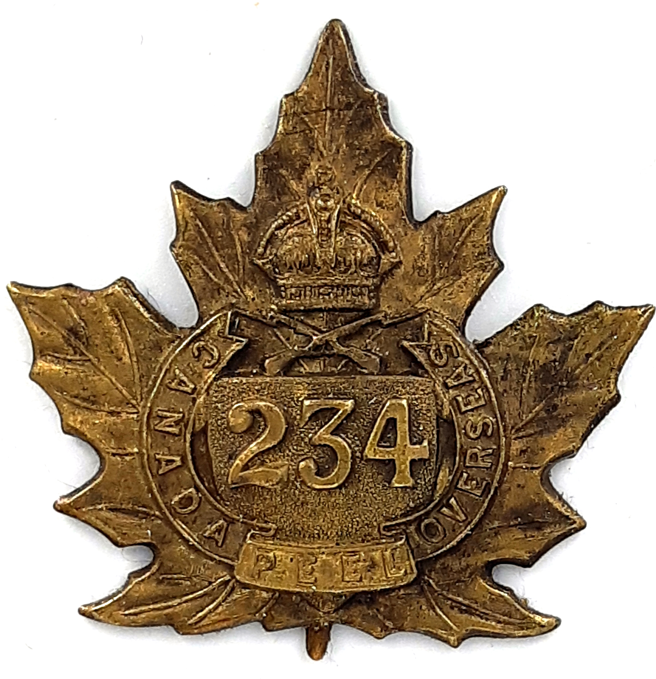 The 234th (Peel) Battalion was recruited by the 36th Peel Regiment and 20th Halton Rifles in Central Ontario with mobilization headquarters at Toronto under General Order 69 of July 15th 1916. These regiments had previously contributed 230 and 171 volunteers respectively to the 4th Battalion on its formation at Camp Valcartier in August 1914 and later helped to raise the 37th, 74th, 76th 126th and 164th Battalions. The 234th Battalion embarked for England on 18 April 1917 under command of Lieutenant-Colonel W. Wallace (14th Infantry Brigade), with a strength of 15 officers and 279 other ranks where the battalion was absorbed by the 12th Reserve Battalion. Being fully depleted of all ranks the 234th Peel Battalion was disbanded effective September 1st 1917 under General Order 82 of 1 June 1918.