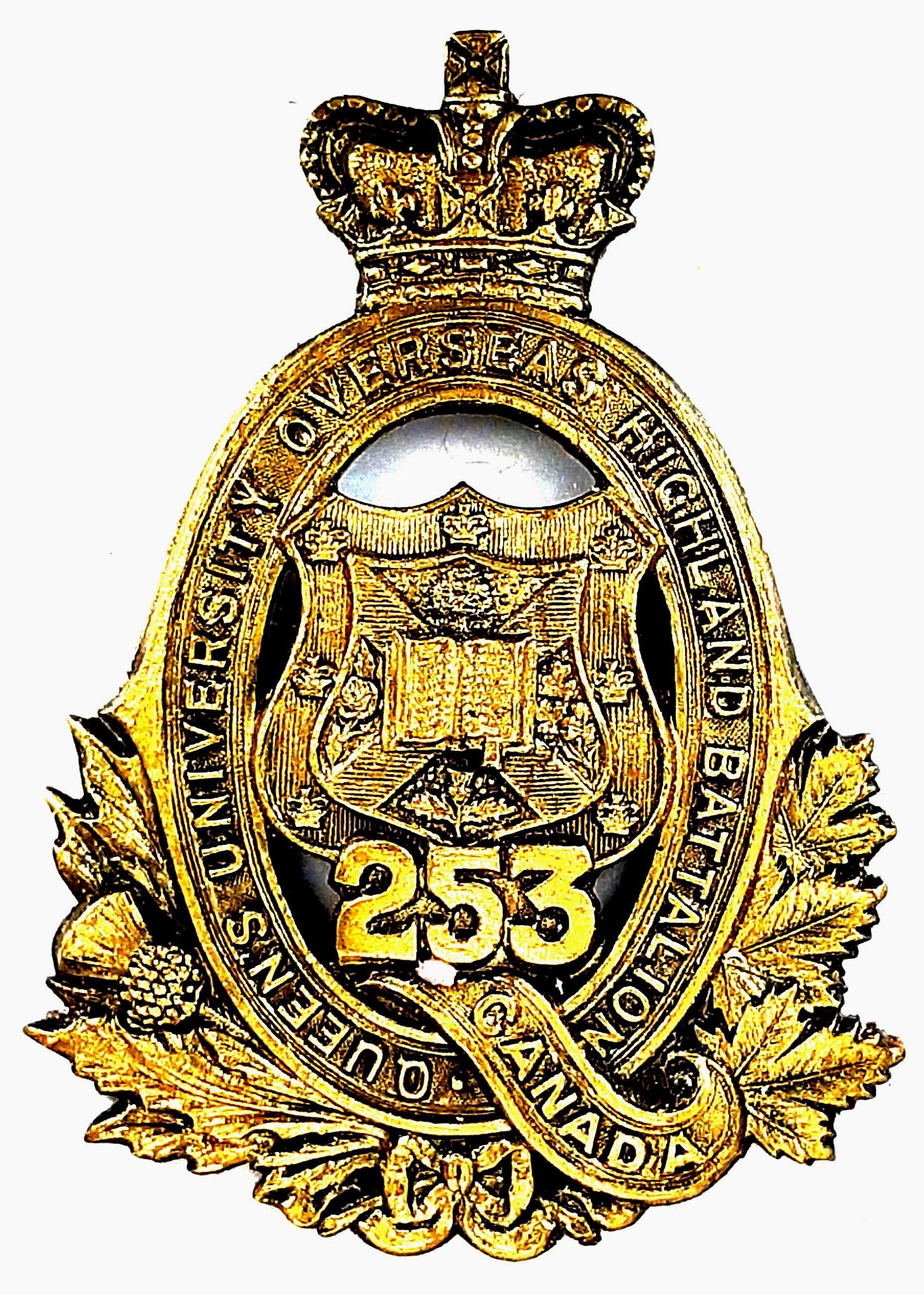 The 253rd (Queen’s University Highlanders) Battalion the battalion was recruited partially from faculty and students of Queens University at Kingston on 25 October 1916 under General Order 48 of 1 May 1917. The 253rd Battalion embarked for England on 29 April 1917 under command of Lieutenant-Colonel P.G.C. Campbell (14th Princess of Wales Own Rifles), with a strength of 17 officers and 461 OR’s where the battalion was absorbed into the 5th Reserve Battalion. Being fully depleted of all ranks the 253rd Canadian Infantry Battalion was disbanded 8 December 1917 under General Order 82 of 1 June 1918.