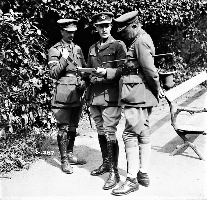 Lieutenant-General Sir Julian Byng, General Officer Commanding the Canadian Corps, 29 May 1916 to 8 June 1917, with Brigadier-General J.G. Farmer, CMG, and Brigadier-General P.P. de B Radcliffe, DSO, May 1917.