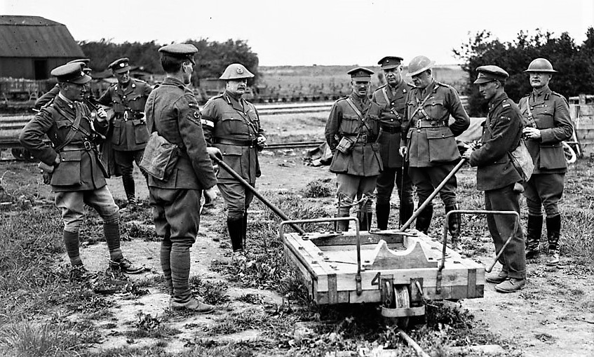 BGen W.B. Lindsay, 5th from the left, inspecting a monorail car. July 1918.