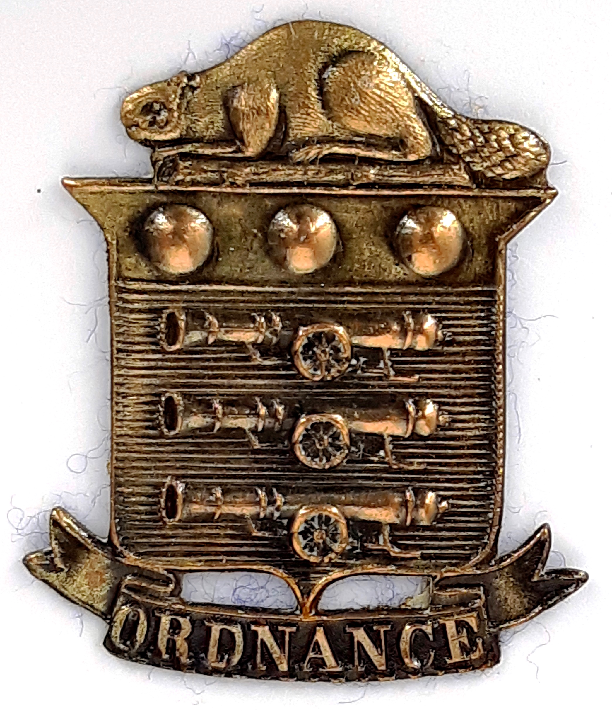 The Canadian Ordnance Corps served as a component of the Quarter-Master General’s Branch. The duties of the Ordnance Corps were to provide clothing, rifles, guns, equipment and ammunition and to maintain supplies of the same; and to provide the personnel to maintain the efficiency of equipment in the field. The Permanent Force component of the Corps was authorized 1 July 1903 under the designation Ordnance Stores Corp. Badges were authorized under General Order 30 of 1904 which reads in part ‘Collar: Gilt or gilding metal, The Ordnance Arms surmounted by the Beaver; height, 17/8-inches; width, 1 ¼-inches. On Puggaree and cloth Forage cap. Same as for collar badge, with a scroll below inscribed “Ordnance.” Height 1-5/8, width 1 ¼-inches. The title was changed to ‘The’ Canadian Ordnance Corps 2 December 1907. A Militia component was authorized 1 April 1912 as the Canadian Ordnance Corps this with three detachments No. 1 at London, No. 2 at Toronto and No. 3 at Kingston.