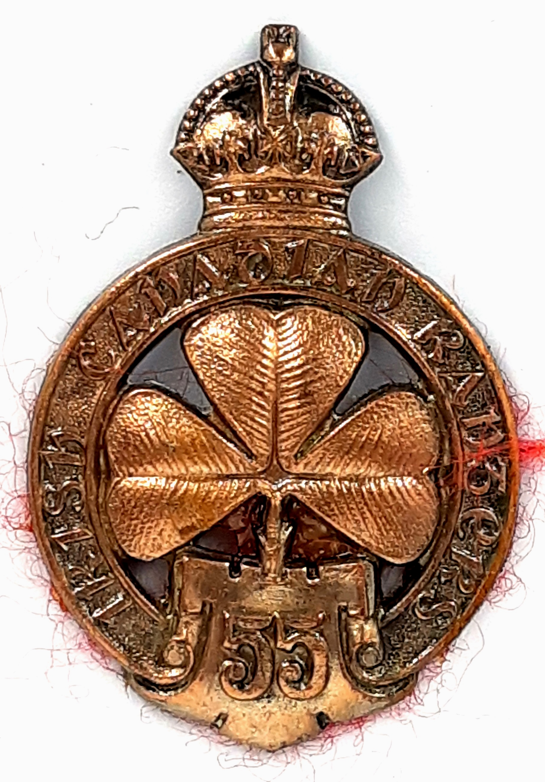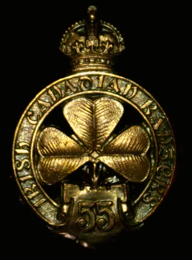 During the First World War, a number of “new” militia regiments were established to recruit volunteers into the militia, a requirement made at the beginning of the war. Some of these regiments were given regimental numbers of defunct military regiments. Although not part of the CEF they are included here for information on the formation of the Canadian Expeditionary Force. These militia regiments were the 55th Irish Canadian Rangers the 58th (Westmount) Rifles, both located at Montreal, Quebec, the 70th Regiment at Hull, Quebec, the 108th Regiment raised at Berlin (later renamed Kitchener), Ontario, and the 109th and 110th Irish Regiments, both raised in Toronto, Ontario. (Chris Brooker)
