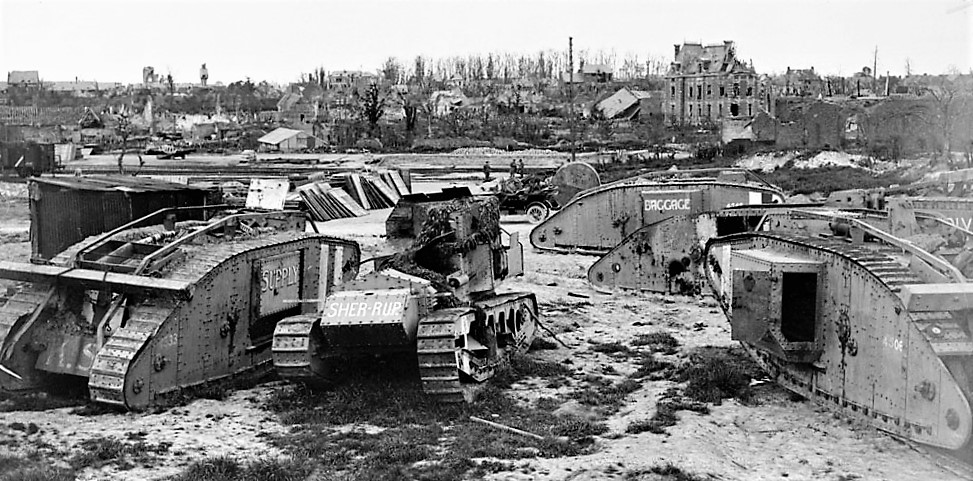 Villers – Bretonneau with assortment of Tanks in the railway yard. April – May 1919.