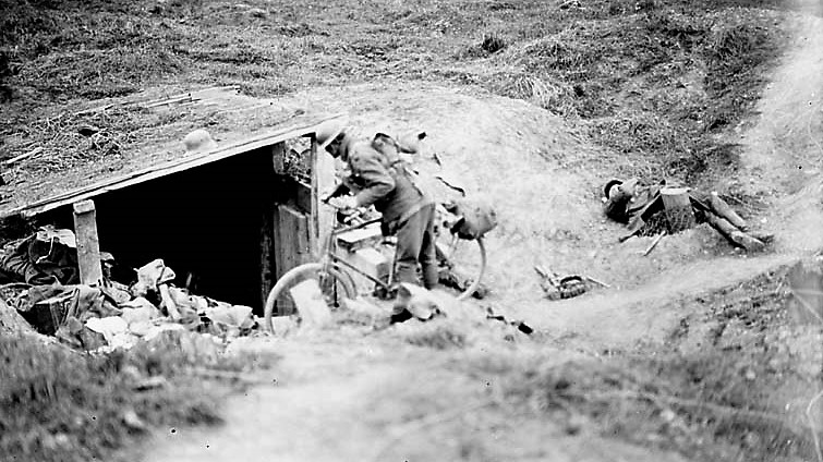 A Canadian cyclist shouting down a dug-out in German for men to come out. Advance East of Arras, September 1918.