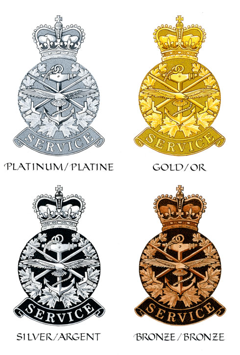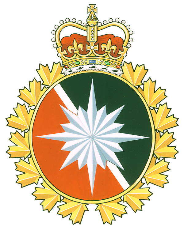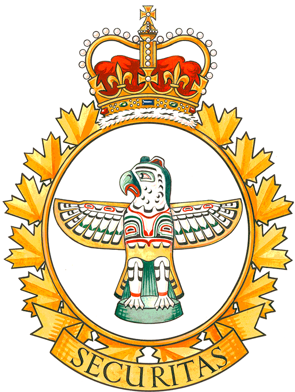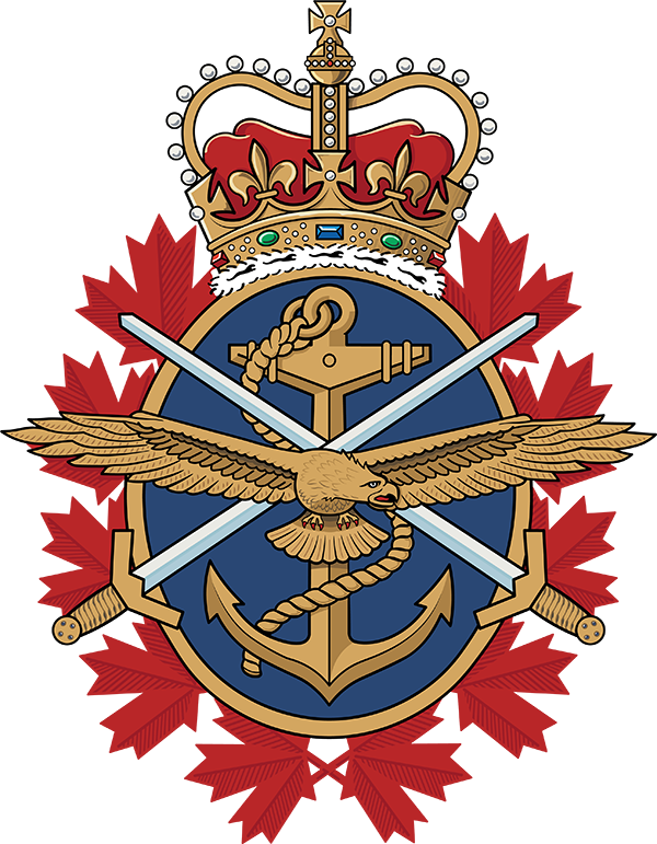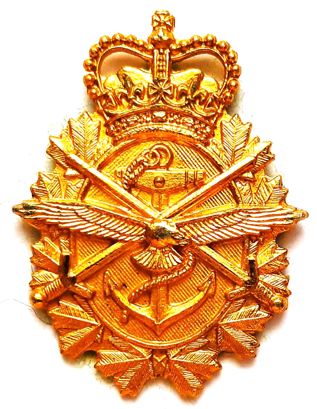 The CF badge (nicknamed the “Pineapple” and the “cornflake”), has a Queen’s crown over an oval wreath of maple leaves, with an anchor, crossed crusader’s swords and an eagle looking right. The badge represents the sea, land and air environments of the Canadian Armed Forces.