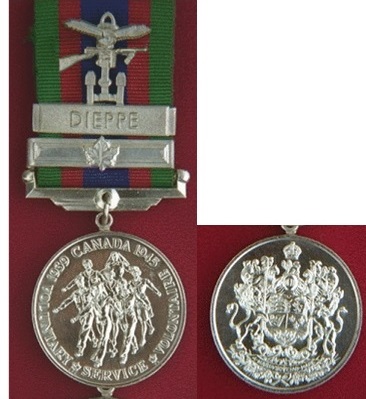 Although the medal was usually awarded to Canadians for six months service in Britain between 03 September 1939 and 08 May 1945, the exact terms were: Service in the forces in non-operational areas subjected to air attack or closely threatened, providing such service lasted for three or more years. Service overseas or outside the country of residence, providing that such service lasted for one year, except in territories threatened by the enemy or subject to bomb attacks, in which case it was six months prior to 02 September 1945. Under the terms of this last condition, Canadians serving for one year in Newfoundland were eligible and persons serving for six months in Hong Kong were also eligible. The qualifying period in mine and bomb disposal was three months. Canadians serving in West Africa, Palestine and India, other than operational air crew, qualified for this medal. Those awarded the GC or GM for civil defence received this medal. Home Guard and others in Britain qualified for this medal.