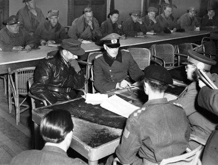 German Lieutenant-General Paul Reichelt (center) and Canadian Lieutenant-General Charles Foulkes (right) during preliminary discussions around 11am regarding the unconditional surrender of German forces in the Netherlands. At Hotel de Wereld, Wageningen, Netherlands, 5 May 1945. War correspondents line the tables behind. Photographer Alex Stirton of the Canadian Film & Photo Unit attended to record the drama unfolding. (Alex Stirton, Library and Archives Canada Photo a137730)