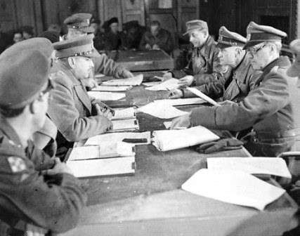 General Blaskowitz. Lieutenant-General (later General) Charles Foulkes, CC, CB, CBE, DSO, CD (left centre), Commanding Officer of 1st Canadian Corps, sitting on the opposite side of the same table where the earlier discussions took place. Foulkes is accepting the surrender of all 117,000 German forces in The Netherlands from General Johannes Blaskowitz (second from right) at 4PM on 5 May 1945 in Hotel de Wereld, Wageningen, Netherlands. Reichelt sits to Blaskowitz’s right. Kitching sits to Foulkes’s left. Prince Bernhard of the Netherlands sits in the foreground on the left. In The Netherlands, May 5th would henceforth become Liberation Day (Bevrijdingsdag), celebrating the end of Nazi occupation in the Second World War.
