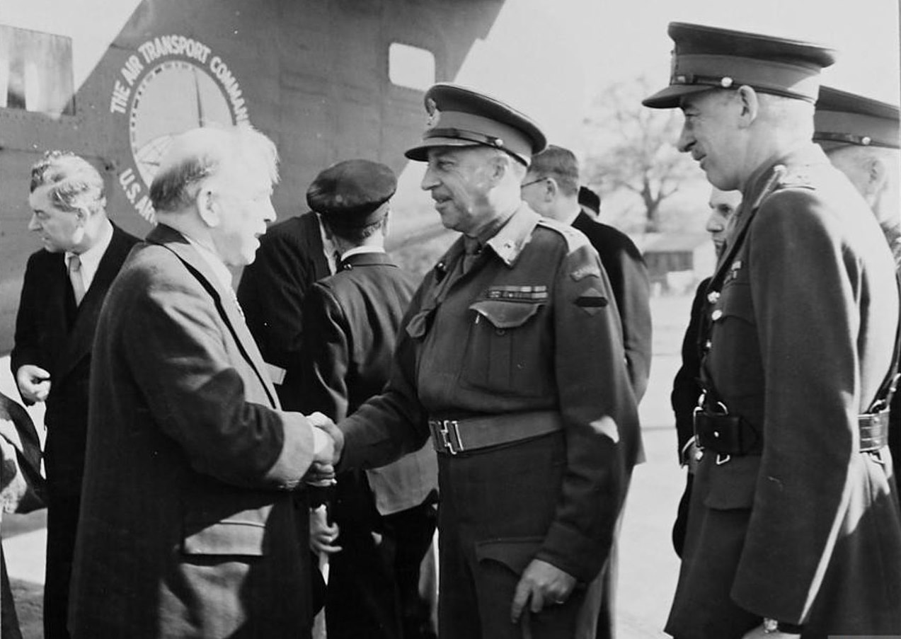 After arriving in England for the Imperial conference, William Lyon Mackenzie King, Prime Minister of Canada, is greeted by is greeted by General H.D.G. Crerar, at that time C- in-C Canadian Forces in Europe, and Lieutenant-General Kenneth Stuart, 28 April 1944.