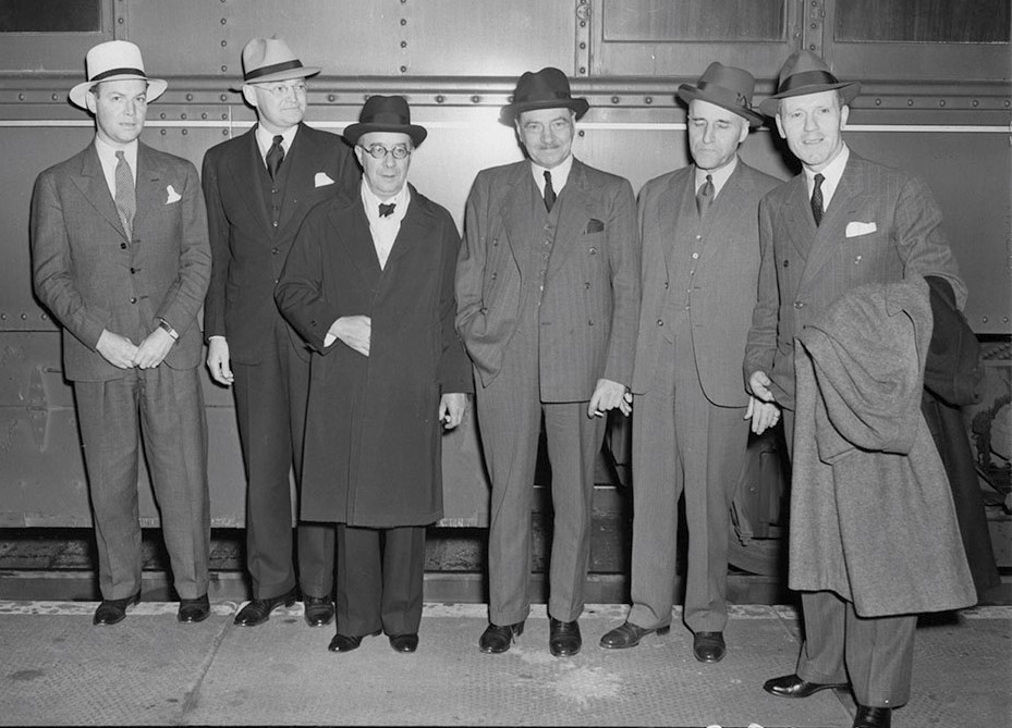 Sir William S. Stephenson, in the grey pants, dark suit jacket at left, on board HMS Prince of Wales along with Winston Churchill and Franklin Roosevelt during their meeting in Placentia Bay, Newfoundland, on 17 Aug 1941.