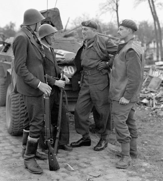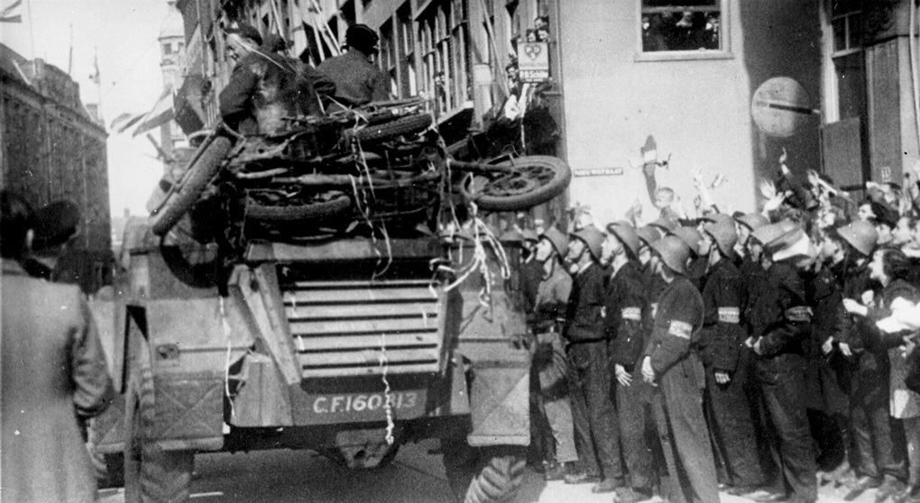 Fox armoured car carrying a Canadian Field Security team, entering The Hague, 8 May 1945, with Dutch Resistance members on the right.