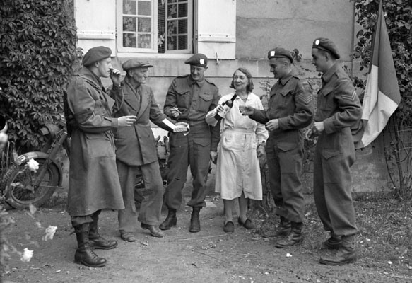 Four members of the 3rd Field Security Section, Canadian Intelligence Corps, sharing a glass of wine with a French couple, Thaon, France, 20 June 1944. Note: the Field Censors have blotted out their cap badges.