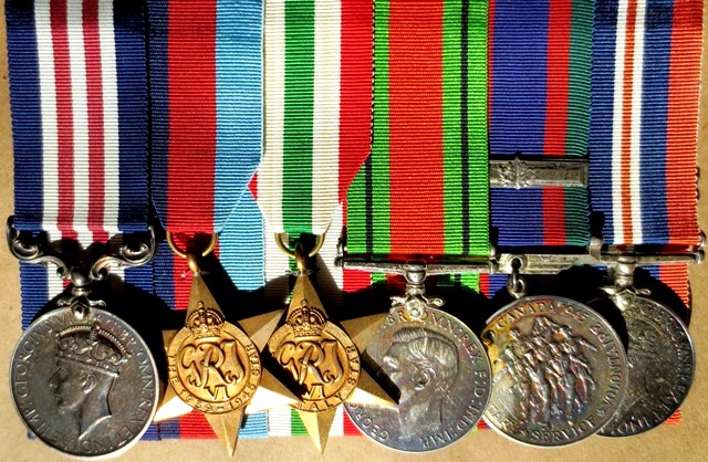 Second World War medals: Military Medal, 1939-1945 Star, Italy Star, Defence Medal, Canadian Volunteer Service Medal, War Medal 1939-1945.