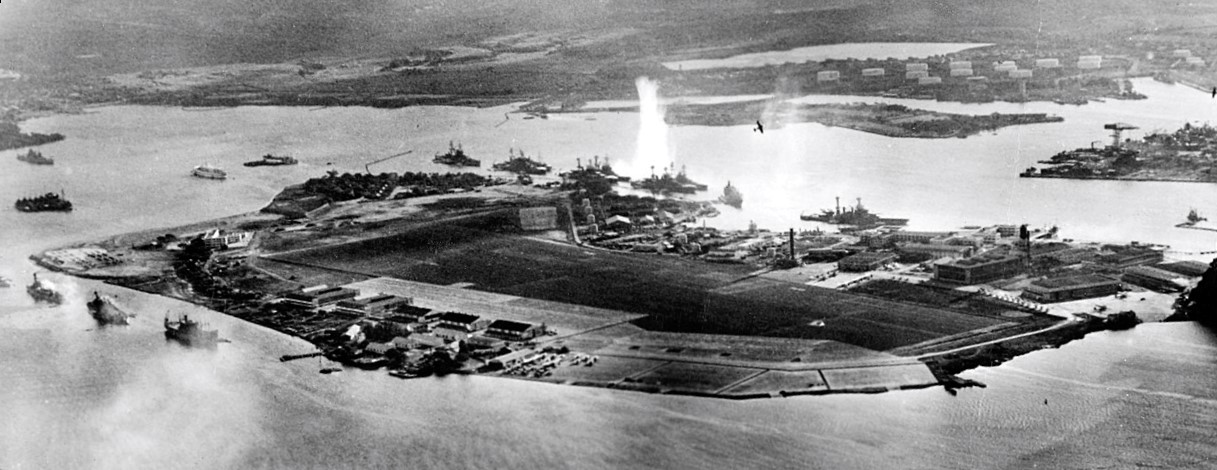 Photograph taken from a Japanese plane during the torpedo attack on ships moored on both sides of Ford Island shortly after the beginning of the Pearl Harbor attack. View looks about east, with the supply depot, submarine base and fuel tank farm in the right center distance. A torpedo has just hit USS West Virginia on the far side of Ford Island (center). Other battleships moored nearby are (from left): Nevada, Arizona, Tennessee (inboard of West Virginia), Oklahoma (torpedoed and listing) alongside Maryland, and California. On the near side of Ford Island, to the left, are light cruisers Detroit and Raleigh, target and training ship Utah and seaplane tender Tangier. Raleigh and Utah have been torpedoed, and Utah is listing sharply to port. Japanese planes are visible in the right center (over Ford Island) and over the Navy Yard at right. U.S. Navy planes on the seaplane ramp are on fire.