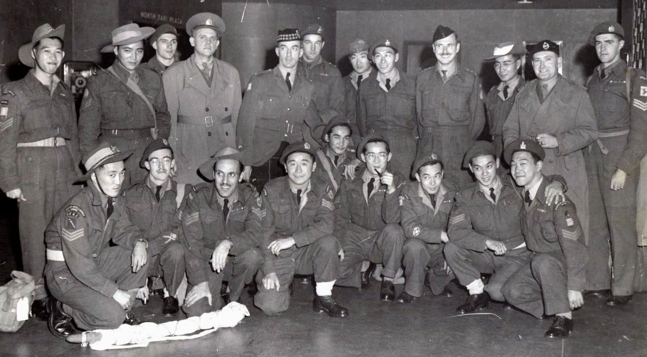 C Int C members returning from the Pacific, arrive at the CNR station in Montreal, Quebec, 25 May 1947. (Note, members appear to be wearing both C Int C and UK Int Corps badges with C Int C shoulder flashes.