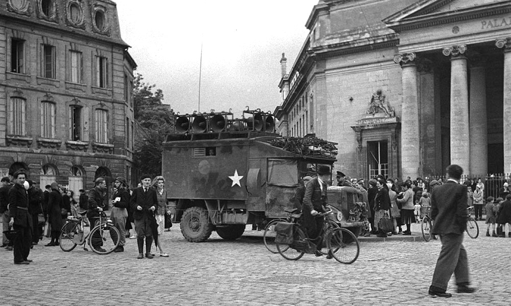 Canadian Army Psychological Warfare vehicle in the streets of Caen, Normandy, 10 July 1944.