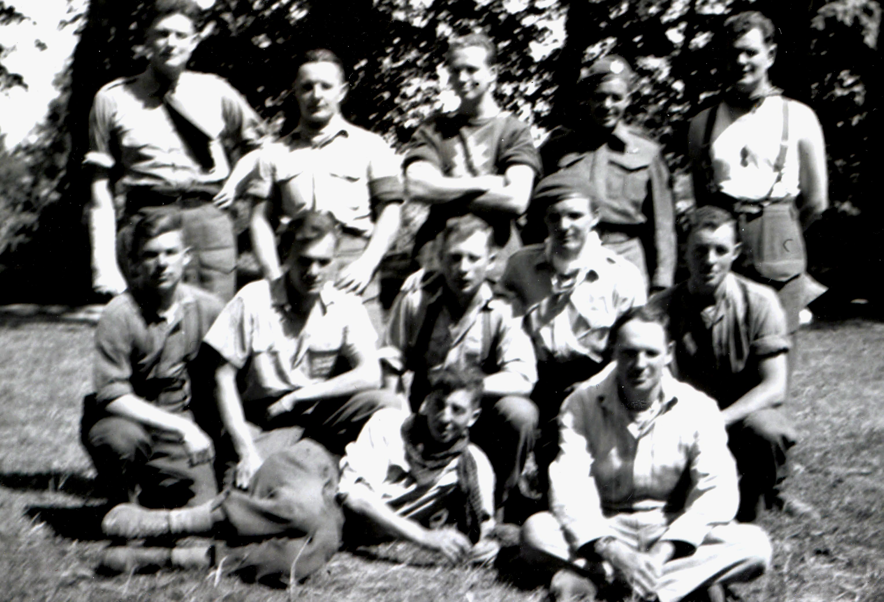 Capt. E.R. Austin and 12 men of No. 17 Field Security Section, Canadian Intelligence Corps, after arriving Normandy, in Cairon, France in late July 1944.
