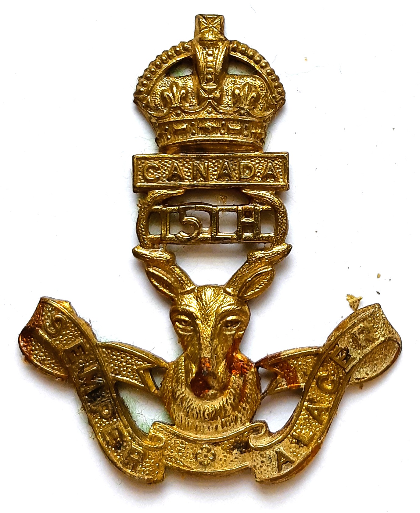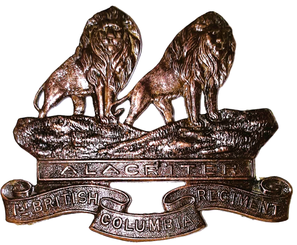 1st British Columbia Regiment, a bronze badge with two lions standing on a rock ledge. Inscribed beneath the ledge is ALACRITER (courageous ready).