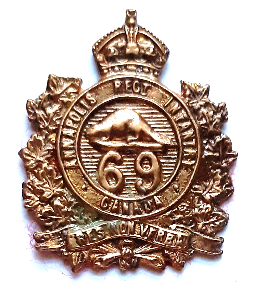 The 69th Annapolis Regiment was an infantry regiment of the Canadian Militia from 8 May 1900 to 1 Apr 1920, with a history going back to 1869.On 8 Oct 1869, the 1st Regiment, Annapolis County Volunteers was formed at Paradise, NS, as an Active Militia unit for Annapolis County, NS. Seven companies were raised at Wilmot, Paradise, Grandville, Port William, and Annapolis Royal and two more companies were raised in 1872 at Bear River and Clement’s Port. Some companies disbanded and others moved during the 19th Century. The regiment was renamed 1st Regiment of Annapolis County on 5 Nov 1869. One company separated on 14 Jan 1870 to form the 72nd Battalion of Volunteer Militia, also known as the 2nd Annapolis Battalion and it is believed the unit was correspondingly renamed 69th (1st Annapolis) Battalion of Infantry. The 2nd Battalion was absorbed in 1898 and the designation again changed, to 69th Annapolis Battalion of Infantry. In 1899, the battalion was organized with 9 companies and headquarters was moved to Malvern Square. On 8 May 1900, as part of the reorganization of the Militia, the battalion was designated as a Regiment, being known as the 69th Annapolis Regiment. Headquarters was moved twice before the First World War, to Round Hill on 1 August 1904 and to Middleton on 2 July 1910. The Regiment contributed a small number of troops to the 14th Battalion, CEF and later recruited men for the 112th Battalion, CEF. On 1 April 1920, as part of the reorganizations suggested by the Otter Committee, the Regiment was redesignated The Annapolis Regiment and perpetuated the 112th Battalion, CEF.