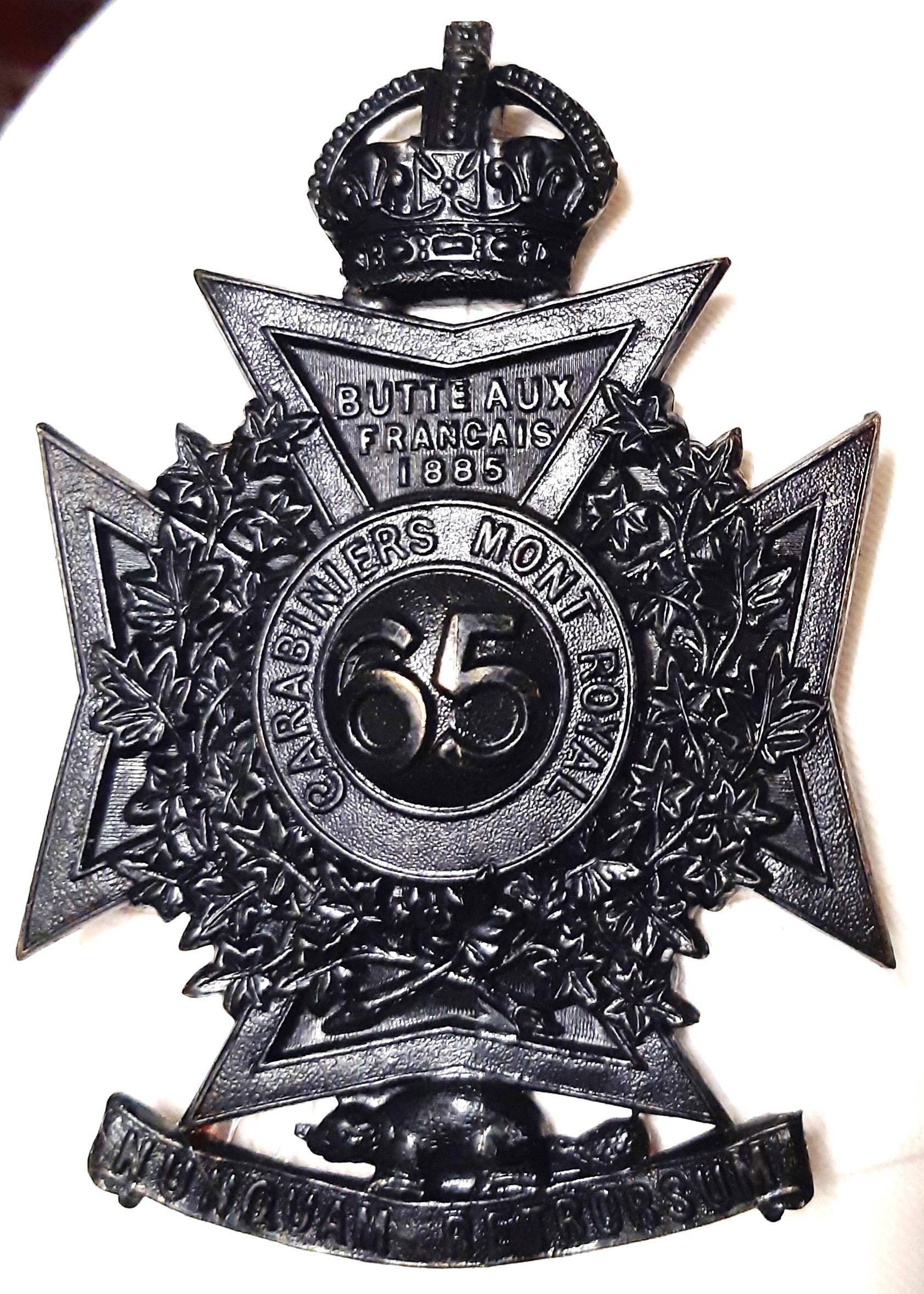 Les Fusiliers Mont-Royal originated in Montreal, Quebec on 18 June 1869 as The Mount Royal Rifles. It was redesignated as the 65th Battalion, Mount Royal Rifles on 5 November 1869, as the 65th Regiment “Mount Royal Rifles” on 8 May 1900 as the 65th Regiment “Carabiniers Mont-Royal” on 1 August 1902, as Les Carabiniers Mont-Royal on 29 March 1920, as Les Fusiliers Mont-Royal on 15 April 1931, as the 2nd (Reserve) Battalion, Les Fusiliers Mont-Royal on 7 November 1940 and finally as Les Fusiliers Mont-Royal on 15 November 1945.Upon redesignation as Les Carabiniers Mont-Royal on 29 March 1920 it was organized as a two-battalion regiment with the 1st Battalion (perpetuating the 69th Battalion (Canadien-Français), CEF) on the Non-Permanent Active Militia order of battle, and the 2nd Battalion (perpetuating the 150th Battalion (Carabiniers Mont-Royal), CEF) on the Reserve order of battle. The reserve unit was disbanded on 14 December 1936.