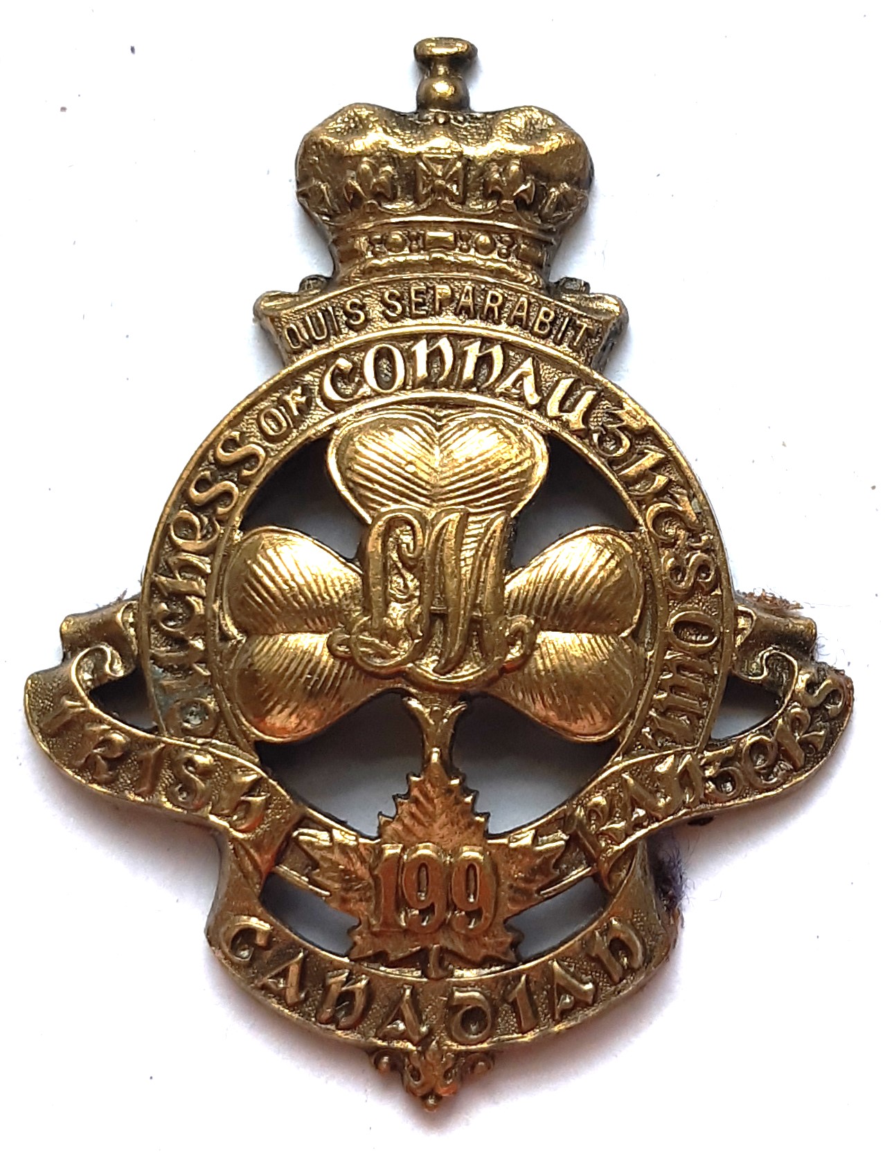 This infantry battalion was founded by the Canadian armed forces to improve their recruitment success by having an all Irish regiment. They were also called the “Duchess of Connaught’s Own Irish Rangers,” as a tribute to Princess Louise Margaret of Prussia, who funded the battalion. Based in Montreal, Québec, the unit began recruiting during the winter of 1915/16 in that city. After sailing to England in Dec 1916, the battalion was absorbed into the 23rd Canadian Reserve Battalion (Central Ontario), CEF on 11 May 1917. The 199th (Duchess of Connaught’s Own Irish Rangers) Battalion, CEF, had two Commanding Officers: Lieutenant-Colonel H. J. Trihey (26Dec 1916 – 10 Jan 1917) and Lieutenant-Colonel J. V. O’Donahoe (10 Jan 1917 –11 April 1917). The Irish Canadian Rangers were part of the Non-Permanent Active Militia of the Canadian Militia. In 1936, the regiment was disbanded as a result of a country wide reorganization of the Canadian Militia, along with 13 otherregiments as part of the 1936 Canadian Militia Reorganization.