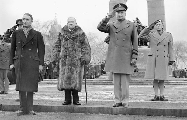 General Dwight Eisenhower taking the salute during a wreath-laying ceremony at the National War Memorial, alongside Prime Minister William Lyon Mackenzie King in the fur coat, 9 Jan 1946.
