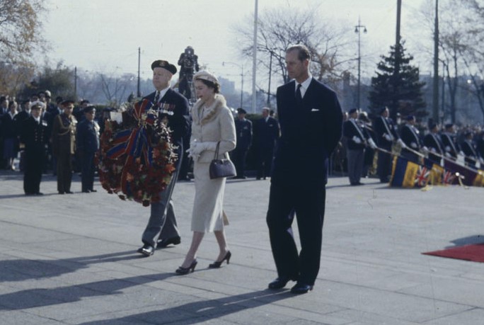 Queen Elizabeth and Prince Philip, accompanied by Dominion President of the Canadian Legion David L. Burgess, prepare to lay a wreath on the National War Memorial, 13 Oct 1957.