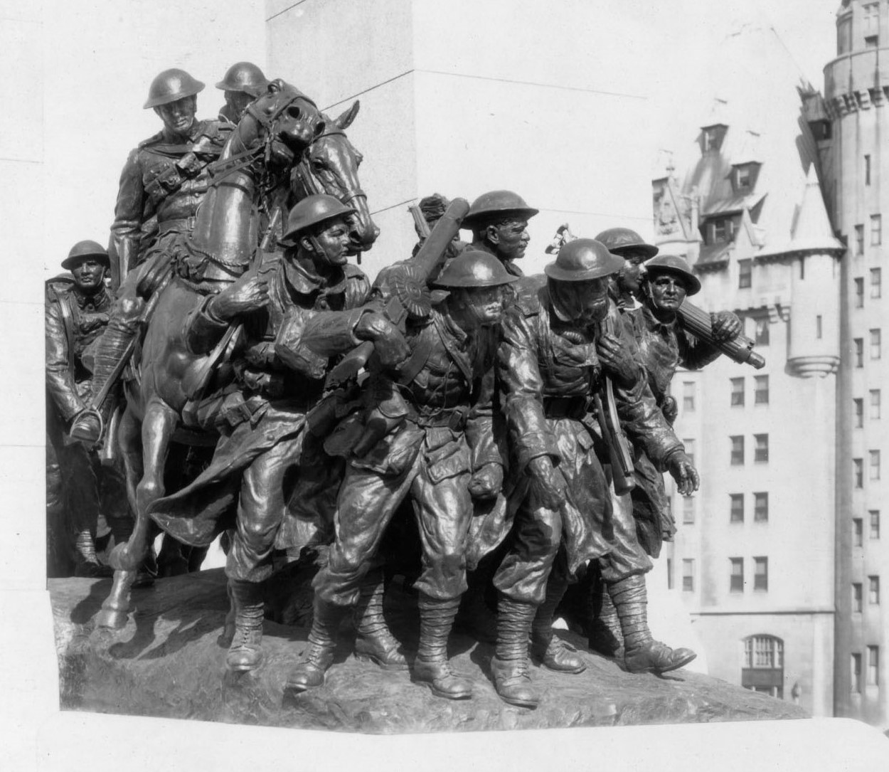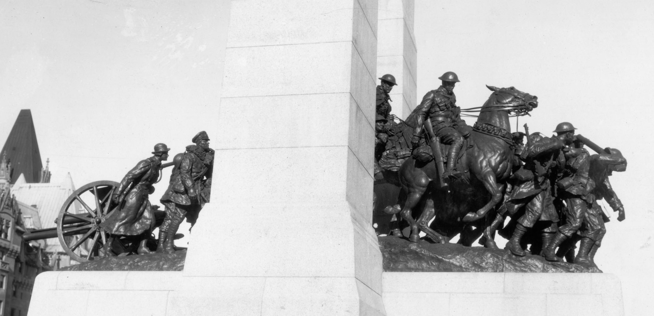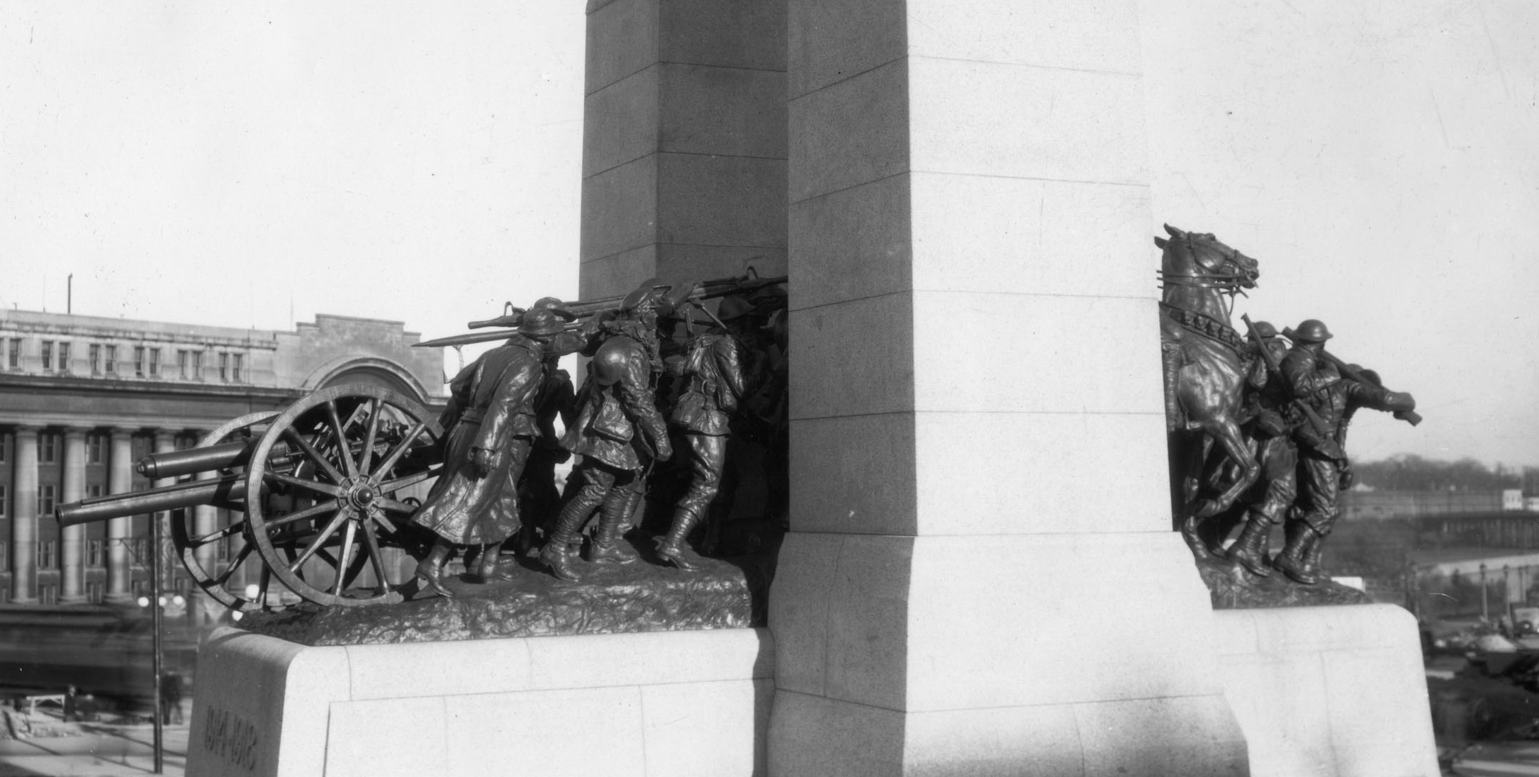 In January 1926, the Board of Assessors selected the model submitted by Vernon March of Farnborough, Kent, England. His theme was “the Great Response of Canada,” represented by uniformed figures from all services passing through a granite arch. The idea, March wrote, was “to perpetuate in this bronze group the people of Canada who went Overseas to the Great War, and to represent them, as we of today saw them, as a record for future generations…” There was to be no suggestion of glorifying war.