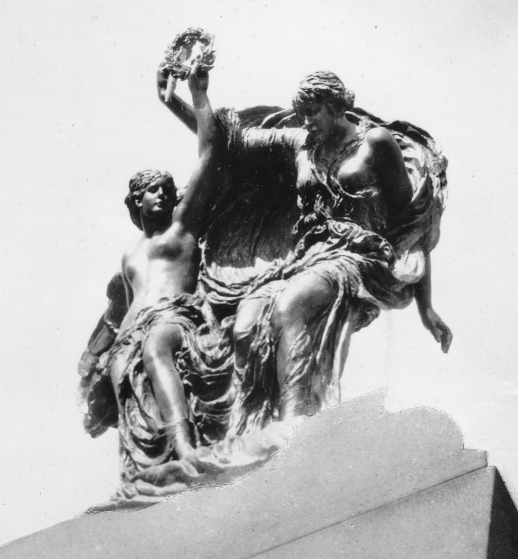 Construction of the National War Memorial – Close-up of the surmounting bronze scuptures depicting Peace and Freedom