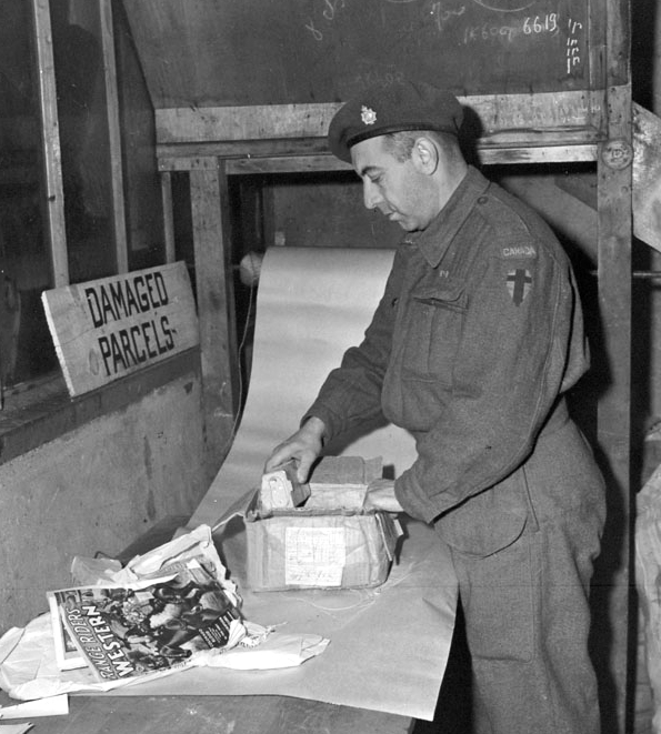Private Leon Biron of No. 1 Army Base Post Office, Canadian Postal Corps (C.P.C.), rewrapping damaged parcels, Dieppe, France, 11 October 1944.